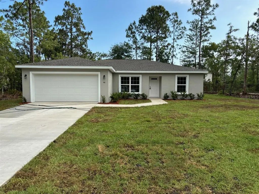 NEW CONSTRUCTION. MOVE-IN READY! Welcome to the Key West model, a beautifully crafted 3-bedroom, 2-bath home offering 1,405 square feet of stylish living space in the peaceful neighborhood of Citrus Springs. Built with durable concrete block construction, this home also features a 30-year architectural shingle roof and energy-saving double-pane windows. Inside, the vaulted ceiling in the living room adds a sense of space and light, while luxury vinyl plank flooring flows throughout. The kitchen is equipped with stainless steel appliances, granite countertops, a subway tile backsplash, custom white shaker cabinets with soft-close drawers, and a walk-in pantry for added storage. The master suite—the largest offered by the builder—delivers exceptional space and comfort, including a glass-enclosed shower and upgraded marble-look tile in the bathroom. The main bath features a tub/shower combo with coordinating finishes. Additional highlights include a laundry room with upgraded cabinetry, a covered patio for relaxing outdoors, and an attached 2-car garage with opener and remotes. Located in flood zone X, this high and dry property requires no flood insurance and comes with the added bonus of no HOA fees.