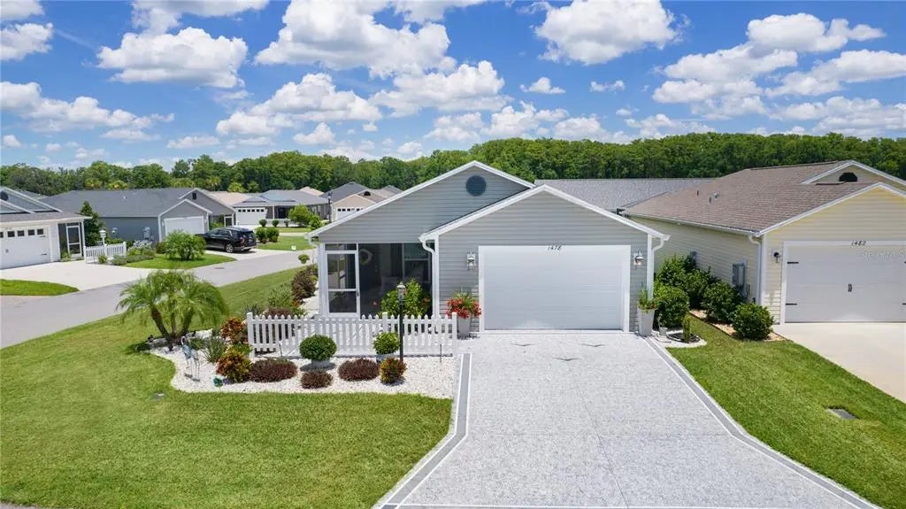 Welcome to your serene slice of paradise in the highly desirable Village of St. Johns in The Villages, Florida! Perfectly situated on a generous corner lot with beautifully custom landscaping, this immaculate 2-bedroom, 2-bathroom home offers both privacy and convenience in a prime location nestled between Brownwood Paddock Square and the Sawgrass Grove Entertainment District. Walk up the beautifully painted driveway/walkway, step inside and immediately appreciate the bright and airy feel created by vaulted ceilings throughout and the abundant natural light that pours in through tinted windows—a thoughtful upgrade that helps keep your home cool during those warm Florida summers. You’ll love that this home is completely carpet-free, featuring easy-care, elegant flooring throughout the entire living space. The open-concept kitchen is as practical as it is stylish, boasting gleaming white cabinetry, a built-in desk/workspace with overhead storage, and a convenient in-kitchen laundry area with washer and dryer included—ideal for both functionality and flow. The spacious master suite is a peaceful retreat with a large walk-in closet and a well-appointed en suite bathroom featuring dual vanities and a walk-in shower. Your guests will enjoy their own private, comfortable space with a bright second bedroom and a full guest bath offering a shower/tub combo. Tucked away on a quiet street with no through traffic, this home offers peace and tranquility while still keeping you close to all the best amenities, shopping, dining, and recreation that The Villages has to offer. Plus, the home’s energy-efficient features help keep monthly electric and gas bills under $200, making this an ideal full-time residence or seasonal escape. And don't miss the whole house water filtration system, which protects your appliances and filters out impurities for a fully clean shower or bath! Whether you’re relaxing inside or enjoying the Florida sunshine outdoors, this charming St. Johns home checks all the boxes—location, comfort, efficiency, and style. Don’t miss your opportunity to live in one of The Villages’ most coveted locations—schedule your private tour today!