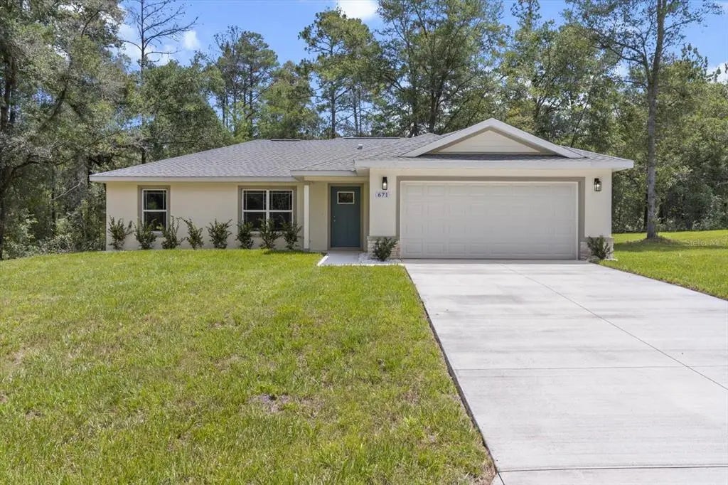 Welcome to your brand-new home in Citrus Springs, where quality craftsmanship meets everyday comfort. This thoughtfully designed 3-bedroom, 2-bath residence is newly completed and built with care by Empire Construction. From top to bottom, it offers stylish upgrades, energy efficiency, and a layout that suits today’s lifestyle. As you enter, you’re greeted by tall ceilings and an open floor plan that makes the most of every square foot. The main living area connects effortlessly to the kitchen and dining space, creating a perfect setup for gathering with friends or enjoying quiet evenings at home. The kitchen is beautifully finished with granite counters, soft-close cabinets, and sleek hardware, all brought together by durable luxury vinyl flooring that runs throughout the home. Natural light pours in through energy-efficient windows and a wide sliding glass door, which leads to a covered patio in the backyard. It’s the ideal spot to relax, grill out, or enjoy Florida’s sunshine in peace. The owner’s suite is set apart from the guest rooms for privacy and includes elegant ceiling details, dual sinks, and a tiled walk-in shower. Behind the scenes, this home is just as impressive. Upgraded insulation in both walls and ceiling helps keep utility bills low. Underground electrical service adds to the clean look of the property, and a meter/main combo provides added convenience for future expansion. A spacious two-car garage with a side access door offers additional storage and functionality. This home is perfectly positioned within a short drive to local rivers, springs, and parks, not to mention shopping, dining, and new retail centers nearby. It’s the kind of place that gives you room to breathe without being far from the essentials. If you’re looking for something new, well built, and ready to go, this one deserves your attention. Builder incentives and closing cost assistance may be available, reach out for details and come see the difference for yourself. Homes like this don’t stay on the market long.