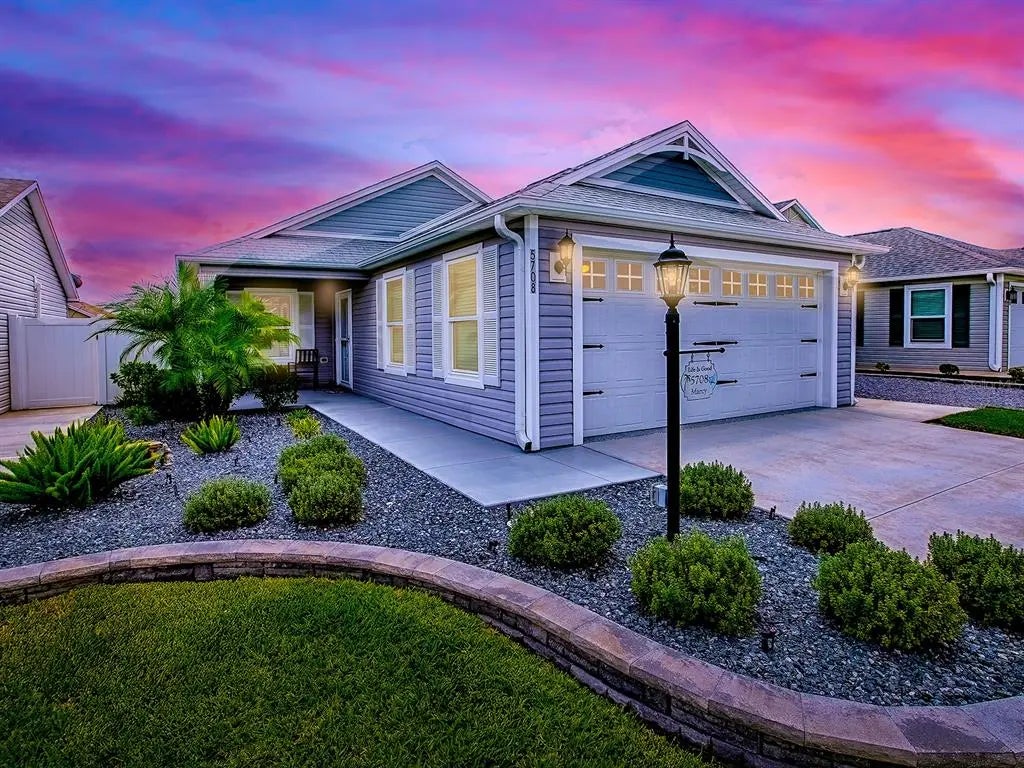Escape to the vibrant community of The Villages, where golf, recreation, and shopping come together in perfect harmony. This stunning Bonifay model courtyard villa is nestled in the picturesque Village of Linden, just minutes from a bustling shopping plaza and a short drive from the newly developed Eastport square. Across the street you can socialize your dog(s) at the Rupert Canine Park & the Riverbend Rec Center is just up the road. As you approach this charming home, you'll be greeted by its impressive curb appeal, featuring a straight-loading, two-car garage with epoxy flooring, a beautifully landscaped stacked stone wall rock beds, and a charming front sitting porch. The painted front walkway and storm door add a touch of warmth and welcome, setting the tone for the elegance that awaits inside. Upon entering, you'll be greeted by a spacious entry foyer w/ a sidelight enhanced front door, where the garage and front door converge. The adjacent hall features a versatile first bedroom/hobby room/den, complete with a closet, and flows seamlessly into the open-concept living area. The high vaulted ceilings create a sense of expansiveness, while the abundance of natural light pours in through the elegantly appointed windows, adorned with wood cornices. The heart of the home is the gleaming white cabinet kitchen, boasting double pull-out drawers, stainless steel appliances, and decorative pendant lighting. The subway tile backsplash and above-and-under-cabinet lighting add a touch of sophistication, while the large pantry closet and NOVA water filtration system provide practicality. The crown molding that runs throughout the house adds a level of refinement, complemented by the vinyl plank flooring in the main living and wet areas. The laundry room is conveniently located opposite the kitchen, featuring a large mop sink cabinet, a row of upper cabinets, and a washer/dryer. Each room is thoughtfully designed, with ample space to suit various needs. The second bathroom boasts a standard vanity with additional cabinets, a built-in tub unit, and extra elbow room. The primary suite is a serene retreat, featuring a lovely tray ceiling framed with crown molding, a wonderful transom window above the bed, and a spacious closet. The bathroom is a true oasis, with a double vanity, separate water closet, generous cabinet and drawer space, and an open, glass edged Roman shower. As you go out onto the covered screened lanai, you'll be enveloped in the tranquility of the surroundings. The spacious courtyard area is a haven, with beautiful plantings, a rear privacy stone wall, and modern stacked stone wall rock beds creating a natural, serene ambiance. This stunning home is a must-see, offering the perfect blend of elegance, comfort, and practicality. With its prime location, beautiful design, and abundance of amenities, it's the ideal retreat for anyone seeking to live their best life in The Villages. Come and experience it for yourself – we can't wait to welcome you!