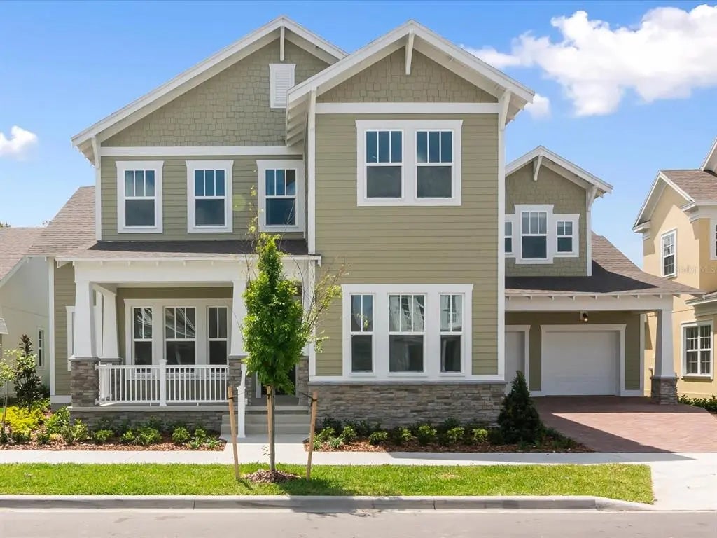 This exquisite two-story home boasts impressive curb appeal, perfectly suited for the charming streetscapes of Island Village. The front porch creates an inviting atmosphere, perfect for welcoming guests and engaging with neighbors. As you enter the home, a dining room and flex room greet you on either side of the foyer, leading to an open kitchen, breakfast nook, and a spacious Great Room. The first floor features a secondary Owner's Suite, offering convenience and versatility for today's living arrangements. A covered lanai opens to a very large backyard for entertaining and relaxing outside. Upstairs you'll find three comfortable bedrooms with two guest bathrooms, and an expansive Owner's Suite which features two walk-in closets and a luxurious bathroom. It doesn't end there! Above the attached garage, you will find a 2 bedroom/ 1 bathroom apartment with a separate entrance which would be perfect for extended family or to be rented out for additional income. This home is situated adjacent to generous green parks and thoughtful gathering spaces, close to beautiful pool amenities, premium recreation centers and walking and biking trail networks that make up the Island Village lifestyle. Even better, when you own in Island Village at Celebration, you are a part of the master-planned community of Celebration with all of the amazing amenities and features within walking and biking distance. Don't miss out on this opportunity to own a beautiful new construction home in a highly sought after area!