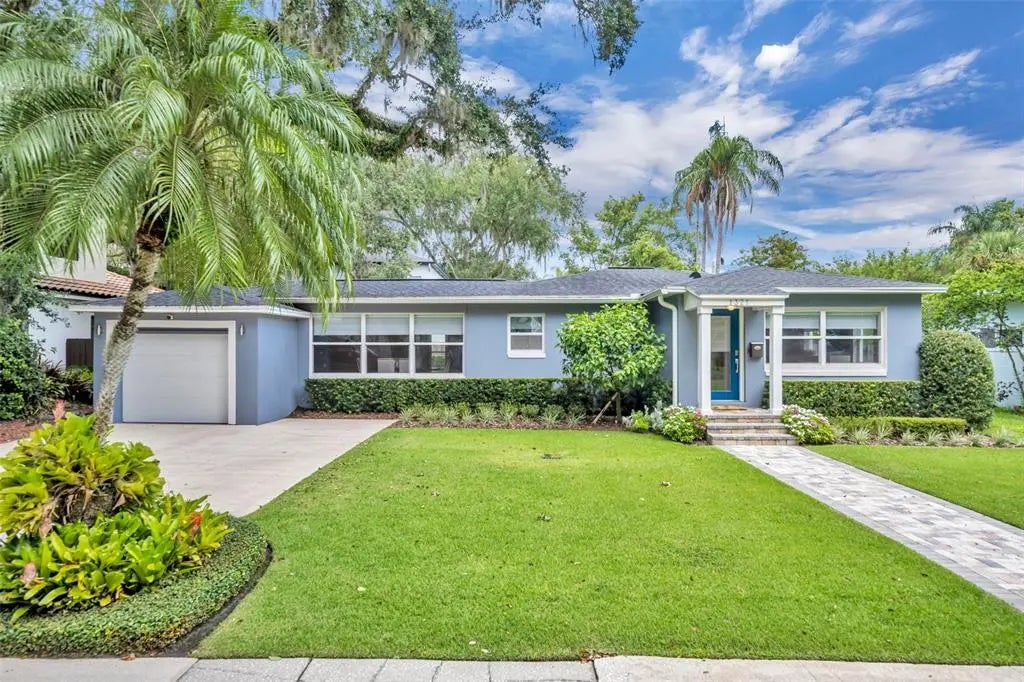 Perfectly situated on a tree-lined street in sought-after Winter Park, this charming, mid-century home has been fully updated with modern style. The main house features 3 bedrooms and 2 bathrooms, while a detached suite offers flexible use with its own walk-in closet and full bath. The spacious great room, bathed in natural light from stylish windows, invites you to relax or entertain guests. A large open kitchen with a breakfast bar, white soft-close cabinetry, granite countertops, and stainless-steel appliances, plus a bright dining room are the center of the house. The primary suite is a retreat, complete with a newly renovated bathroom featuring a walk-in shower, standalone soaking tub, dual sinks, and French doors that fill the space with light. A secondary bedroom and updated bath with classic subway tile enhance the home’s charm, and an office off the dining room offers the flexibility to serve as a third bedroom with its own closet. Outside, enjoy two open patios surrounded by new landscaping, perfect for gatherings or serene relaxation. AC was updated in 2022 and roof was installed in 2016. Updates include an AC unit installed in 2022 and a roof installed in 2016. Zoned for top-rated Dommerich Elementary, Maitland Middle, and Winter Park High Schools and just 10 minutes from iconic Park Avenue shopping and dining. This stylish home is move-in ready and invites you to enjoy the best of Winter Park living!