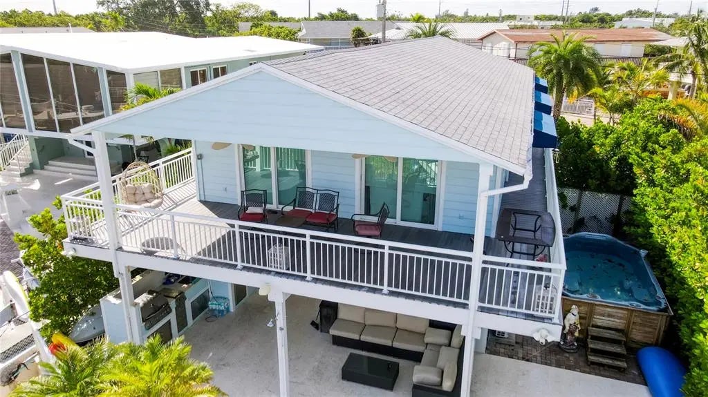 Seasonal rental available in the beautiful neighborhood of Hammer Point, located in Tavernier, FL, at mile marker 93. Available from October 1, 2024, through April 30, 2025, with a minimum stay of 28 days. Longer stays receive better rates. Fully furnished. Enjoy the bayside lifestyle with a range of outdoor amenities, including a built-in BBQ, outdoor TV, pergola, 15,000 lb boat lift, additional docking space and a hot tub. Bring your own boat or take a paddle board out to explore the clear waters and wildlife of the Florida Keys, then rinse off with an outdoor shower. The property is just a short boat ride to Tavernier Creek, providing quick access to the open ocean. Nearby, you'll find restaurants, parks, movie theaters, and other entertainment options. Main living space upstairs is a 2/2 and downstairs is a 1/1 with private entrance. Living room has sliding doors that open up to your wrap around deck and balcony with views of the bay. Enjoy your morning coffee relaxing in the ocean breeze or sit inside and enjoy the views. Guest room upstairs has a pair of twin beds. Plenty of space for you and your guest.