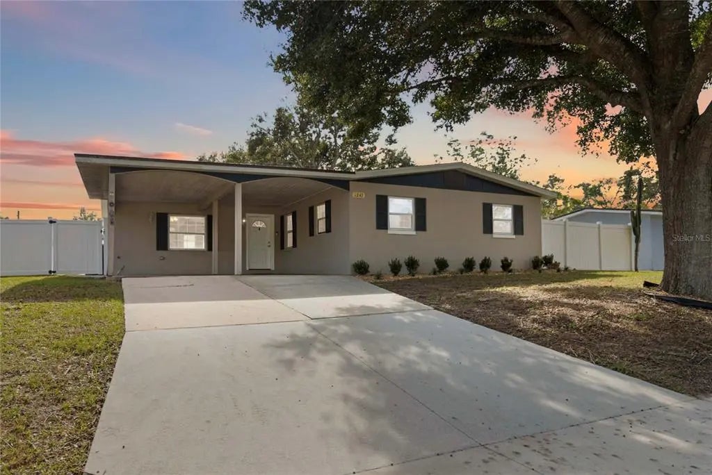 Don’t miss out on this hidden gem, a completely renovated 3-bedroom POOL HOME with 2 full bathrooms inside the main home, plus a half bathroom near the pool. Nestled away in this quiet, well-established neighborhood, this NO HOA home also boasts the privacy of a split floorpan and desirable, large backyard fully enclosed with a beautiful new privacy fence. This is a turnkey home with nothing left for you to do but enjoy! In 2018 this home was remodeled from the studs up, including a NEW ROOF with energy efficient spray foam insulation, new HVAC units inside and out, new air ducts, double pane windows, interior doors, electrical wiring, porcelain tile throughout (no more carpet!), new plumbing, new kitchen with stainless appliances, new cabinets, granite countertops, backsplash. In addition, the pool has been resurfaced, pool pump system installed, and the 2-car carport added. The beautiful low-E French doors in the living room include blinds between the glass panes (no more dusting!) and welcome you to the backyard sanctuary. Between the recently custom-designed walk-in closet in the primary bedroom to the two separate closets in bedroom 2, this home provides plenty of storage space. By the kitchen, you’ll find a laundry room with storage, leading to another exterior door to the backyard. The Maytag washer and dryer were purchased in March 2024, and the stainless steel fridge was just purchased in October 2024. In 2022, recessed lighting was added in the dining room, and a new smart stainless steel microwave over range installed as well as. At the front door, the ring doorbell camera also conveys with this home. Entertainment, shopping, groceries and more are all nearby, and the proximity to major roads makes access to the Orlando airport, theme parks, and other destinations quick and easy. Downtown Apopka is close, making it easy to enjoy all the local festivals and holiday celebrations. You can enjoy the small-town feel and access to parks, amphitheater, dog parks, playgrounds, lake parks and more, while still having access to all Orlando has to share. Don’t miss this true hidden gem. It’s rare for a fully-updated, Central Florida pool home in this price range to hit the market, and it’s priced to sell. Schedule your private showing today, and ring in the New Year in your beautiful new home, floating your worries away in your backyard pool.