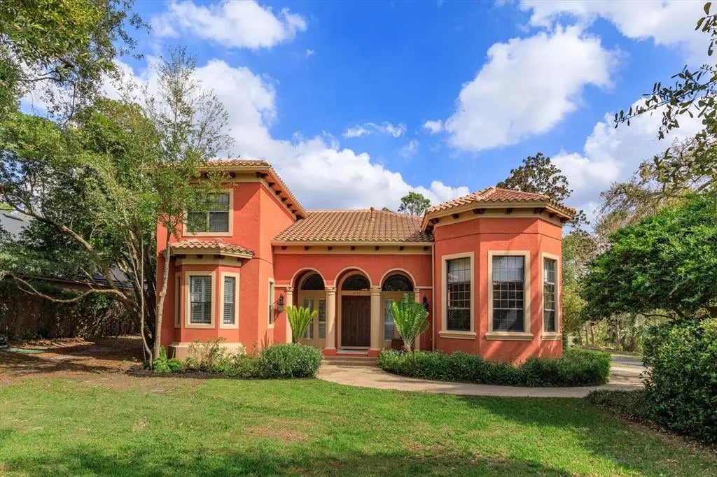 Experience Elegance and Comfort in Your Dream Mediterranean Pool Home. This custom solid block home with a 3-car garage sits on nearly 3/4 of an acre in the exclusive Sturbridge Oaks Subdivision in Winter Springs. The Mediterranean-style pool home, surrounded by mature landscaping, is in a gated community of only 7 homes. With 4 bedrooms plus a bonus room and 4.5 baths, it is perfect for family living or entertaining, thanks to its open floor plan and 3 sets of French doors leading to the pool and lanai. The unique concrete floor pattern complements the solid wood ceiling beams. The downstairs master bedroom has 2 walk-in closets and a luxurious bath. Next to the powder room is the home office or 2nd bedroom, with a built-in bookcase and a good-sized closet. The 4 tall windows provide plenty of natural light, making this home office or bedroom a great place to read or retreat. The kitchen features a walk-in pantry, gas stove, granite countertops, convection oven, subzero refrigerator, and an adjacent wine cellar. The 2 upstairs bedrooms share a Jack-and-Jill bath, and the loft area includes a wet bar and a quiet zone. The swimming pool with spa features water fountain and hanging baskets of flowers, along with an outdoor full bath and kitchen. The outdoor kitchen breezeway leads to a private entrance to the bonus room or in-law suite, which has a full bath and kitchenette. This bonus room, separate from the main house, is ideal for a young adult or visiting guests. This gated community is close to great schools, parks, shopping, dining, UCF, 417, 426, and 434. The home is available for quick closing and immediate occupancy.