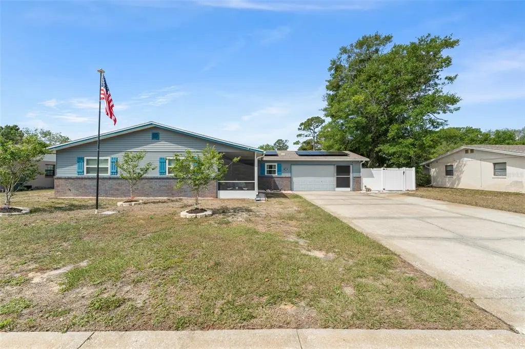**This property qualifies for a closing cost credit up to $4,800 through the Seller’s preferred lender.** Welcome home where comfort, space, and style meet. This beautiful NEWLY UPDATED 4-bedroom, 2-bathroom home sits on a spacious OVER HALF-ACRE lot, offering privacy, functionality, and room to grow. The solar panels make this property energy-efficient and budget-friendly, and this home also offers a brand-new AC outside and iside units from 2024. Pull into the oversized driveway and step onto the newly screened-in front porch, perfect for enjoying your morning coffee. Inside, you’ll find an open concept kitchen and living room highlighted by a stylish brick accent wall. The kitchen is a chef’s delight with a central prep island featuring breakfast bar seating, stainless steel appliances, and cabinetry with a coastal pop of color. French doors open to the backyard, seamlessly blending indoor and outdoor living. The dining room is located at the front of the home just off the kitchen while all four bedrooms and both bathrooms are located down a private hallway, providing a functional and thoughtful layout. At the back of the home, the Florida room offers a versatile space for a home office, playroom, or gym. Step out to the screened-in back patio and take in views of the expansive, fully fenced (vinyl) backyard—a blank canvas ready for your personal touch. A shed offers additional storage for your outdoor needs. Recent upgrades include a new electrical panel (2021), house surge protector (2022), epoxy lined cast iron drain pipes throughout the house to the street with a 25-year warranty (2023), new windows (2022), new flooring (2022), new French doors (2022), new wiring in part of the home (2024), and a new vinyl fence (2023). Don’t miss the opportunity to make this flexible and spacious home your own!