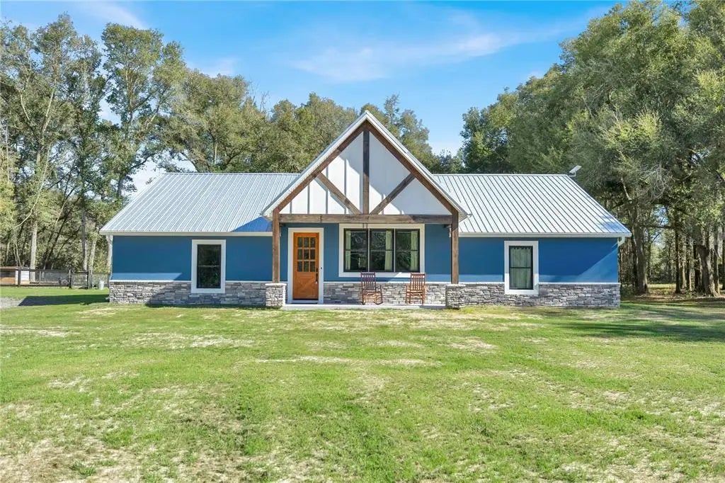 Discover this stunning 3-bedroom, 2.5-bathroom 2023 CBS Custom Home, nestled on 10 acres in the serene farmland preservation area of Marion County. Spanning 2,400 sq ft, this property features a split bedroom floor plan with an open layout and cathedral ceilings in the living area. It includes an office space, an expansive living room, a family room, granite countertops, and a combination of LVP and tile flooring. The charming tongue and groove porch ceilings and efficient LP gas system add to the home's appeal. The home boasts several custom-built features and elegant trim work/moldings throughout. Enjoy the covered front and back porches, with the back porch plumbed for an outdoor kitchen. Outdoor amenities include an impressive 109'x50' pole barn with an 85'x20' lean-to, complete with concrete floors, water, and electric, as well as a 50-amp RV hookup and washer and dryer connections. Stalls can easily be incorporated into the pole barn. The property is gated and perimeter fenced, located on a dead-end street, and zoned A1 (agriculture), ready to accommodate livestock once cross-fencing is added. Located in close proximity to Ocala's finest equestrian venues: The World Equestrian Center (18 mi), Ocala Jockey Club (11 mi), and the HITS Post Time Farm (19 mi). The City of Ocala is a feasible 20 minute drive, where you can find full-scale grocery stores, dining, and shopping. This property perfectly combines luxury with functionality, ideal for those seeking a peaceful countryside lifestyle.