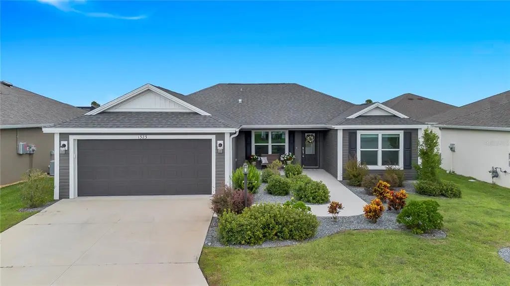 Beautiful 3 bedroom 2 bath Bougainvillea model, located in the Village of Hawkins. You will love the inviting front porch, beautiful landscape and curb appeal of this home. From the moment you enter you will be impressed with the open floor plan with a large living area over looking the dining room and lanai. The double glass sliding doors leading to the spacious lanai bring in tons of natural light. The mature landscape offers extra privacy outside. The modern kitchen has a huge island perfect for enjoying morning coffee and breakfast or for entertaining family and friends. All new stainless steel appliances, gas cook top stove with microwave, French door refrigerator with water and ice dispenser, high ceilings, hard wood cabinets and beautiful porcelain tile floors throughout the entire home! The neutral grey and beige colors are sure to match any decor beautifully. The extra large primary suite offers plenty of room for a king size bed and all of your furniture. There are two walk-in closets and en-suite bath with extra large walk-in shower and double vanities. Two large guest rooms offer space for a guest suite and an office. Separate laundry room inside with utility sink, washer and dryer included. This home is only 2-years old and has so many upgrades. The Village of Hawkins is conveniently located near Magnolia Plaza, several executive golf courses, the Continental Country Club, Soaring Eagle Softball Complex and the Ezell Recreation Center where you can meet friends and participate in many activities and sports such as tennis, pickle ball or aquatic fitness. The Villages has activities for every interest. Schedule your private showing today.