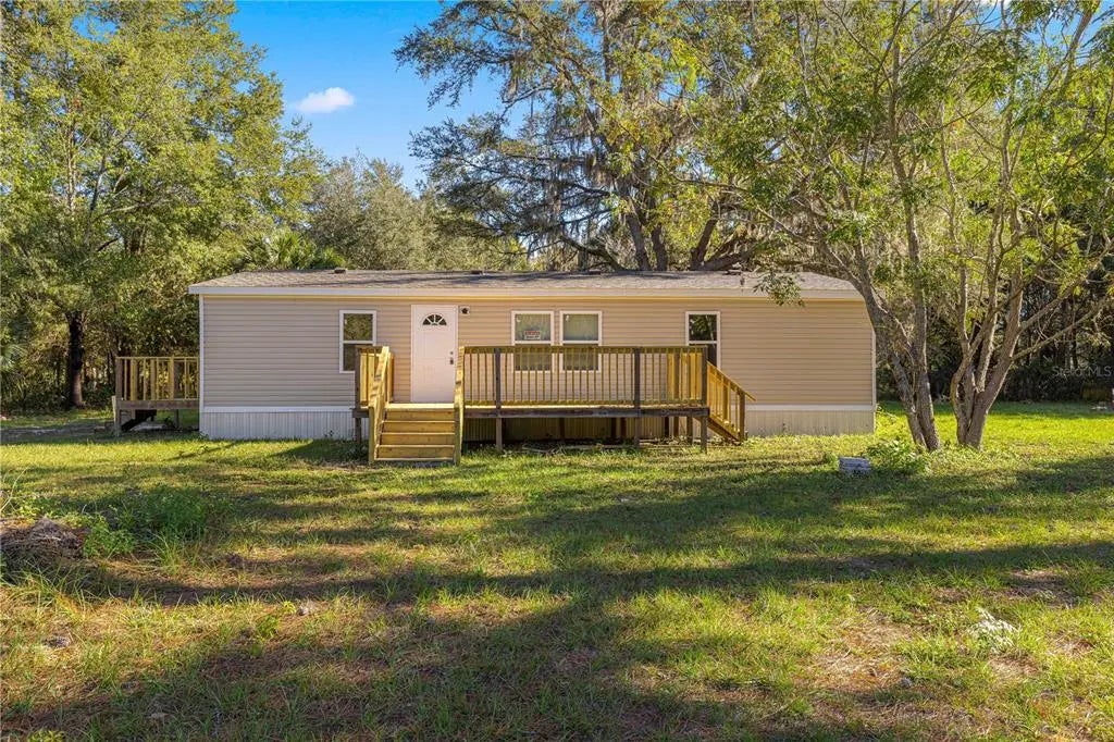 One or more pictures are virtually staged. Imagine a completely renovated, spacious and modern mobile home nestled on a generous fenced plot of land. The home features an open floor plan with new windows that lets in plenty of natural light. The kitchen is equipped with Samsung Stainless appliances and a cozy dining area. The living room is perfect for relaxing, with enough space for comfortable seating. The master bedroom includes an en-suite bathroom with a separate soaking tub, newly tiled shower and dual vanity. Additional bedrooms and bath are on the opposite side of the home. Outside, the extensive land offers endless possibilities. You can create a beautiful garden, set up a playground or even start a small farm. The surrounding landscape provides privacy and tranquility but conveniently off a paved road, making it an ideal retreat from the hustle and bustle of daily life. Whether you're looking to entertain guests or enjoy peaceful solitude, this mobile home and its expansive land offer the perfect combination of comfort and space. The exterior includes two newly installed decks and a 380 sqf enclosed lanai. Roof and HVAC installed July 2024, new siding and skirting & new hot water heater. Home qualifies for all financing including FHA and USDA.