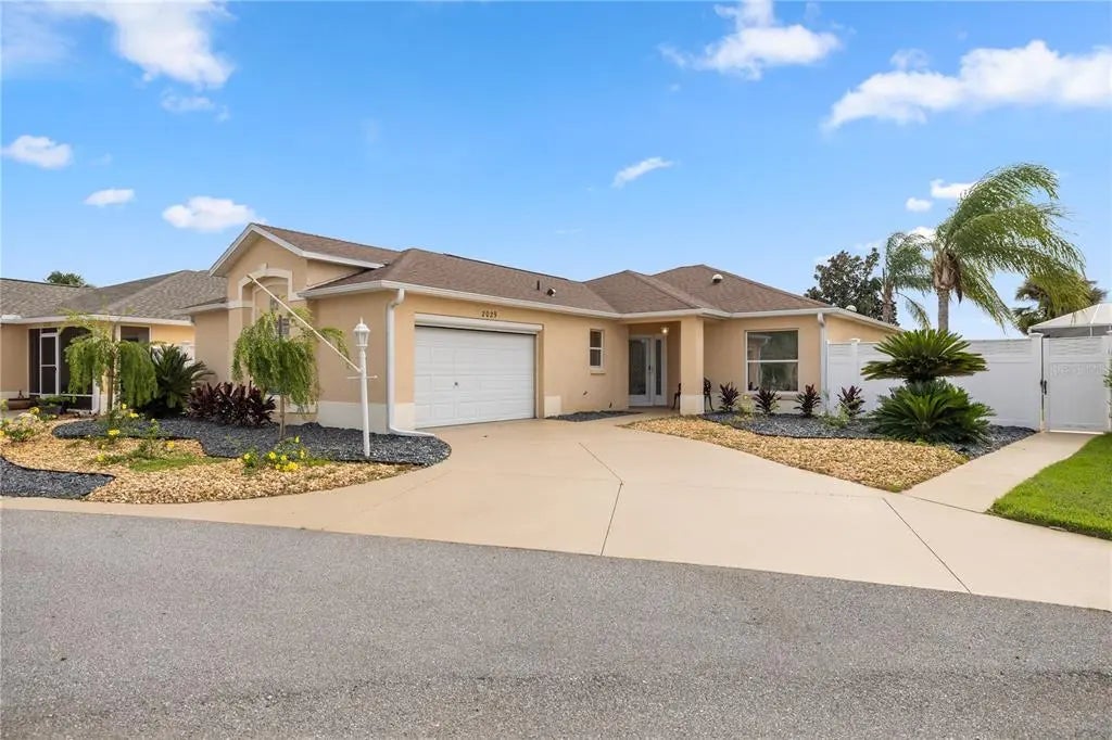 NEWER ROOF! NEWER AC! FURNISHED! Welcome to your dream oasis in The Villages! This stunning updated 3-bedroom, 2-bathroom pool home boasts a 1.5-car garage and a relaxing jacuzzi, all overlooking a picturesque pond on the golf course. Furnished with an inviting open floor plan, the home features vaulted ceilings and an eat-in kitchen adorned with quartz countertops and a spacious island perfect for entertaining. LVP flooring flows seamlessly throughout, leading to a formal living room and an enclosed sunroom that bathes the space in natural light. The primary suite is a true retreat, offering serene views of the pool, a double vanity, a walk-in closet, and a beautifully tiled shower. Outside, enjoy ample seating in your private courtyard surrounded by new landscaping. With plenty of room for your car and golf cart, this home is tucked away in a peaceful part of the community, yet just steps from the community pool. Conveniently located near shopping, restaurants, and medical facilities, this gem is ready for you to call home. Don’t miss the chance to make this stunning property yours!