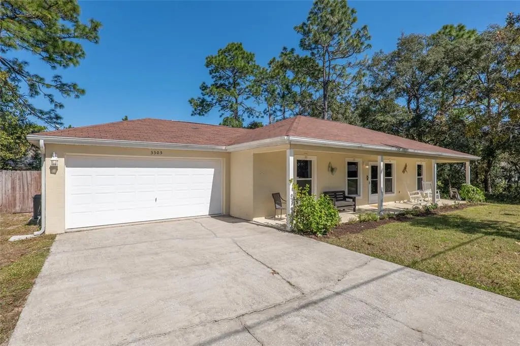 Beautiful 3/2/2 home with NEW ROOF INSTALLED BEFORE CLOSING! You'll love the FRONT PORCH across the front of this home! Concrete block stucco. Split bedroom plan ~ NO CARPET ~ vaulted ceilings ~ French doors to lanai. Cute kitchen with pantry. Primary bedroom has walk-in closet with ensuite and linen closet. Inside laundry room has extra storage. LARGE back yard with privacy fence. Peaceful neighborhood. Citrus Springs has no HOA dues but offers two golf courses, tennis courts and Withlacoochee State Trail, a 46-mile paved recreational trail suitable for hiking, biking, and skating.