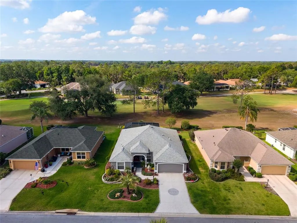 POOL HOME ON THE GOLF COURSE!! No Bond!! This is a rare opportunity to own a spectacular home in The Villages that offers so much without leaving your property!! As you pull up to the home, you will see pride of ownership throughout, starting with the extensive landscaping that surrounds the home on all sides. Upon entering the home, you immediately see the stunning view of the golf course right out your back door! Also evident in every room is the well thought out floor plan, with tasteful and convenient features affording luxurious living. The home has elevated ceilings contributing to the open feel, crown molding throughout, extra detail around windows and sliding glass door. The comfortable living room has two large windows and a very large four panel sliding doors leading to the lanai and what a lanai it is!! Already offering the wonderful golf course view, your outdoor living experience will be enhanced with a beautiful pool, all under a bird cage screened area for ultimate outdoor living! In addition, there is a built in wet bar with a sink and refrigerator, which is perfect for meal preparation, storage and counter space for your outdoor dining and barbequing. This is the ultimate year-round outdoor living experience in Florida! Back inside, you will appreciate the designated dining room, as well as the breakfast nook off of the kitchen. The kitchen offers ceramic tile floors, white wood cabinets and all stainless steel appliances. The primary suite is located on one side of the home, offering privacy from the other two bedrooms. The primary suite has a lovely entry, a sliding door directly to the lanai, two walk-in closets, and an en-suite bathroom with a linen closet, dual sinks and a newly renovated shower. The second bedroom is spacious, with a built-in closet, and nice sized window. The third bedroom can be used as an office/den, or with a wardrobe, used as a third bedroom. Between the two bedrooms is a second bath, with a tub/shower combination. The laundry room is large, and includes built-in cabinets for additional storage, as well as a solar tube, making the laundry room light and bright. Don't wait to tour this extraordinary home - it is indeed a rare find!