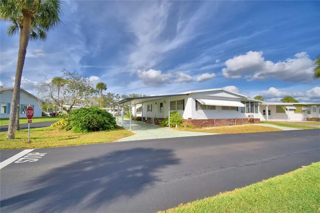 Location! Location! Location!!! This home is located in the beautiful Oakwood Estates, a 55+ community. It is situated on a corner lot with a beautiful view of Dinner Lake. The carport is a drive through making it convenient to access the home. The huge size porch offers an amazing and peaceful view of the lake. Although there are technically only two bedrooms, there is a (bonus) room. the Bonus room has no closet, but there is a walk in closet directly across the hall. There are two storage sheds for the handyman and additional storage. The air conditioner is approximately two years old as is the refrigerator. The roof over adds extra insulation for energy efficiency. The home is located close to one of the two pools in the community as well as right across the street from the main clubhouse where you can easily attend all the many functions offered at Oakwood Estates. Join in the activities or simply sit with your morning coffee and watch the world go by. Call today for your private viewing appointment.