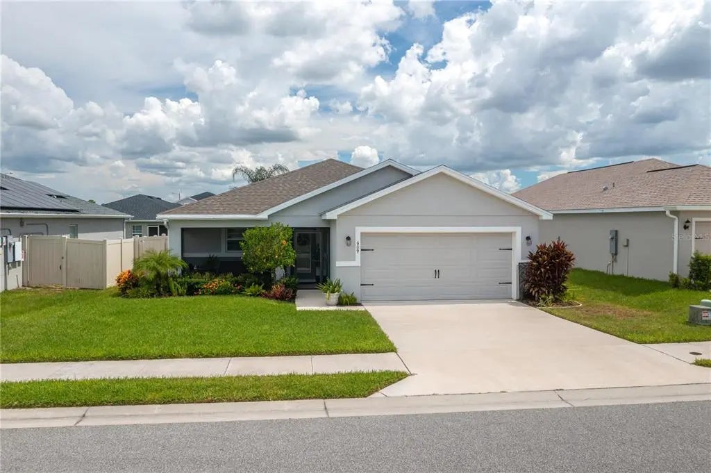 Step into this spacious home and prepare to be impressed with this beautifully maintained, move-in ready home and prepare to be impressed. The bright and open living area features soaring ceilings, luxury laminate flooring, and a seamless flow into the kitchen—complete with a pantry, breakfast bar, and dedicated living area. You will immediately notice all the upgrades. The primary suite offers a serene retreat with vaulted ceilings, generous walk-in closet, and a private en-suite bath featuring a tiled walk-in shower. Two additional bedrooms are generously sized and include ample closet space. A dedicated laundry room provides extensive storage, cabinetry, and a convenient folding area. Enjoy indoor-outdoor living with a covered lanai accessible from the main living area, surrounded by a vinyl privacy fence for added seclusion. The screened-in front porch area offers additional space for relaxation, both patio areas are equipped with sun blocking shades The home also boasts a well-maintained irrigation system and beautifully landscaped yard. A spacious two-car garage provides plenty of extra storage. This desirable community offers a carefree lifestyle with access to amenities such as a pool and meticulously maintained common areas. The sellers are highly motivated—schedule your private showing today!