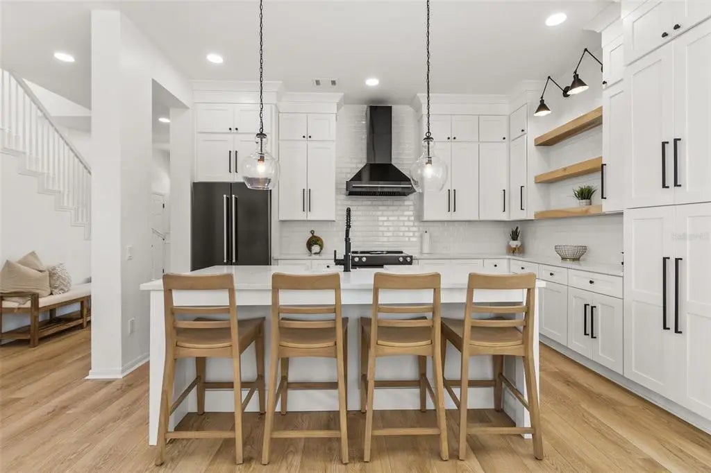 Welcome to 1238 Golden Canna Lane, nestled in the highly coveted Aquila Reserve community of Celebration, FL! This newly renovated residence is ready for you to move in and start making memories. Just one block from serene lakes and scenic walking paths, this home offers an ideal blend of modern comfort and natural beauty. This home offers three well-appointed bedrooms and 2.5 bathrooms within its 1,879 square feet. As you step into the inviting foyer, you'll immediately sense the warmth and comfort that this home exudes with newly installed wide plank white oak luxury vinyl flooring throughout the home, custom geometric wood trim, and much more. Natural light floods the generous living and dining areas, highlighting the spacious open floor plan. The newly re-imagined kitchen is a chef’s dream, featuring white shaker cabinetry, black matte pulls, elegant quartz countertops accented with custom geometric trim on either side of the island, sleek matte black appliances, a farmhouse sink, a stylish commercial-inspired hood, and chic floating shelves for additional storage and display. The living space includes a cozy room with an electric faux fireplace, perfect for relaxing evenings and creating a welcoming atmosphere. Transitioning to the second floor, one notices the beautifully redone blond hardwood treads with white risers. The primary bedroom is a true retreat, boasting a large walk-in closet. The primary bathroom offers gorgeous details, including white hexagon mosaic flooring, a large soaking garden tub/shower combination, upgraded wall tile, and a free-standing furniture-style vanity. The guest bathroom has been newly renovated to include luxurious ceramic tile, a single vanity, and a white tub/shower combo. For your convenience, the laundry room is also located on this upper floor. New flooring throughout the house adds to its modern and low-maintenance appeal, while the open front porch and large patio extend your living space outdoors. The 2-car garage offers extra storage, and shrubs ensure your privacy. Quality outdoor living is yours to enjoy with a lush green lawn and spacious patio, perfect for both quiet relaxation and entertaining guests. Notably, the home offers a NEW ROOF in 2024, adding to its overall value and peace of mind. Don’t miss the opportunity to make 1238 Golden Canna Lane your new home. This beautifully renovated residence is ready to welcome you home!