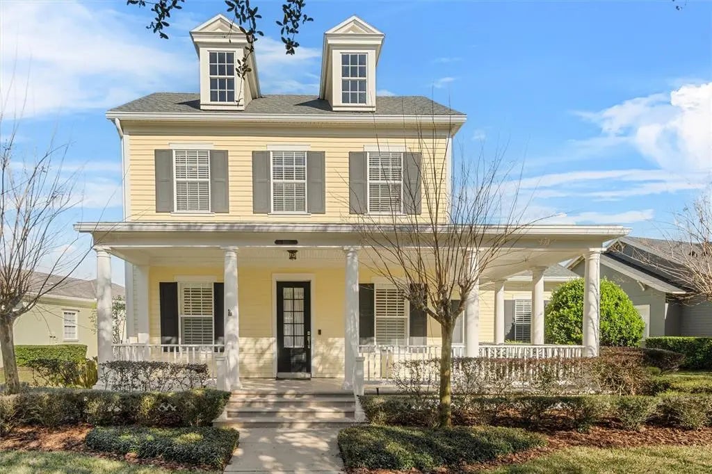 This beautiful 5 bedroom, 41/2 bath Penfield model (3755 sf living area) is situated on a .22-acre lot, on a quiet mature tree- lined street in Celebration's Artisan Park neighborhood. The deep front wrapped covered porch affords sun or shade during the day. The Private ARTISAN CLUBHOUSE is exclusively for Artisan Park Residents and includes RESORT STYLE CLUBHOUSE with a BAR, RESTAURANT and Meeting/Party Rooms, and a state-of--the-art FITNESS CENTER. This home features a First Floor PRIMARY BEDROOM with XL closet, a bath with double vanities, large soaking tub, walk in shower, linen closet and private water closet. The main floor also has a FORMAL DINING ROOM with wainscoting accents and LIVING ROOM, a large GATHERING/FAMILY ROOM with dramatic soaring ceilings and numerous windows. The OPEN KITCHEN has granite countertops, stainless appliances (one is a range with double oven) and a granite DINING table and an additional BREAKFAST DINING area with additional seating for 6 and Countertop dining too! (Refrigerator 2020, 2024 dishwasher microwave and dishwasher). Beautiful cherry engineered HARDWOOD FLOORS flow throughout the main floor. An amazing amount of recessed lighting and lighting for artwork plus all the windows make this home exceptionally light and bright. There is a HALF BATH and a LAUNDRY ROOM and a coveted private junior HOME OFFICE on the main floor too. The second level has a signature staircase that leads to Three additional large bedrooms and 2 Full Baths; one of the bedrooms has a built-in Murphy Bed and a full bath with walk in shower. The second full bath has 2 basins, a linen closet and lockout tub/toilet room for convenience. The attached oversized two car garage with XL parking pad for two cars has built in overhead storage racks, a huge lockable Storage Room and under stair storage as well. A Full ONE BEDROOM GARAGE APARTMENT is accessible from the garage interior or from the exterior. The kitchen is fully amenitized with granite countertops, dishwasher, microwave and refrigerator and range. There is also a full-size stacked washer/dryer! A perfect addition for guests, family, home office or as an income-producing rental. The home is ENERGY EFFICIENT with a 2020 AC System, a 2017 AC system, two water tanks (2024 and 2020). The ROOF was replaced in 2019. Beautiful high end Plantation Shutters save energy! The extra-large lot features a private, fenced rear yard with patio and an included Hot Tub! The exterior was painted This Home, on This Lot, at this exceptional Price, awaits your visit!