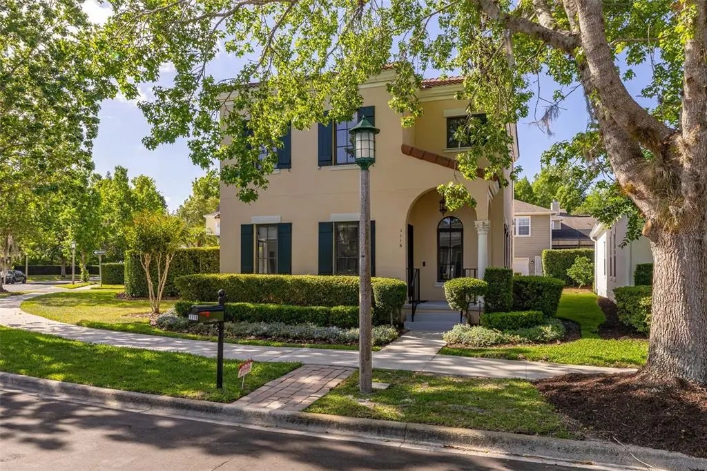One or more photo(s) has been virtually staged. Nestled among the mature oak tree lined streets of East Village in Celebration, this exquisite Mediterranean bungalow POOL HOME offers an expansive amount of meticulously designed living and entertaining space. As you enter the home you are greeted with hardwood flooring, custom window trim work, swing out casement windows, 4 inch baseboards, crown molding, wainscotting, decorative stonework, and Lutron recessed lighting systems in each bedroom and throughout the home. Just past the foyer, the oversized dining room flows seamlessly into the chefs kitchen. The kitchen includes alabaster colored square raised hardwood cabinets with soft close drawers, Alaska cream colored granite countertops with pop-up outlets, stainless steel farmhouse sink with touchless gooseneck faucet, under cabinet lighting, pull-out drawers, and wine rack. Stainless steel Samsung Fridge, GE Profile Built in Ovens, dishwasher, cooktop and vented hood complete this look. Passing through the living room you enter your personal oasis where a heated pool and spa awaits. This oversized corner lot showcases a spacious patio and fenced-in back yard, perfect for gatherings and leisurely afternoons while the screened in lanai is ideal for al fresco dining. The office has been modified to create an additional FIRST FLOOR ENSUITE with FULL BATH to give flexibility for use as a home office or guest suite. The staircase is adorned with wrought iron spindles and white risers, and leads to the primary ensuite and guest rooms. The primary suite provides a private retreat featuring a tray ceiling, breakfast bar, and plenty of natural light. The primary bathroom is adorned with 12x18 ceramic tile, custom dual vanities with quartz countertops and floor lighting, a soaking tub, and a separate shower with frameless glass, shower seat, tile to the ceiling and shower system with wall body spray panels and rain head. The custom California and walk-in closets offer convenience and sophistication to complete this look. The secondary bedrooms include recessed lighting and flank the 2nd bath which includes single vanity with marble countertop and a shower/tub combo with backlit shower niches. The laundry room with washer and dryer includes more custom cabinetry, counterspace, sink and drying rack. Just a few blocks from the trails to Downtown Celebration and a few miles to all that Disney has to offer, this home embodies luxury living in a serene setting, inviting you to embrace the Celebration lifestyle.