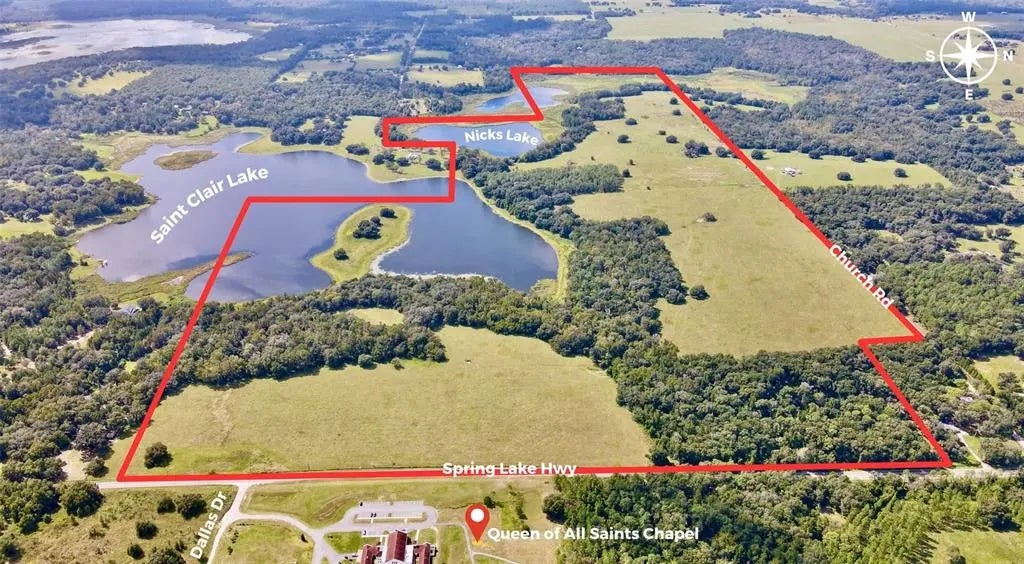 The St. Clair Lake Ranch is a 346-acre lakefront property on Spring Lake Highway in Brooksville. This sprawling ranch features rolling hills, improved pastures, and frontage on two shimmering lakes (St. Clair Lake and Nicks Lake). Improvements include cattle pens, one 4" well, and perimeter and cross fencing. This ranch offers a rural setting while still being within an easy commute to the downtown life, allowing easy enjoyment of both lifestyles. Its diverse habitat, including shrubbery, wildflowers, oak hammocks, planted pine, and woods, bring the property to life. The property is zoned AG (Agricultural) and has future land use of Rural. It's estimated to consist of 225 acres of uplands and 121 acres of wetlands/lowlands. It has frontage on two roads - Church Road (2,000 ft) and Spring Lake Highway (2,800 ft). St. Clair Lake Ranch is located on the west side of Spring Lake Highway (County Road 541) in Brooksville in southern Hernando County. It's less than one mile north of the Pasco County/Hernando County line. The property is centrally situated between downtown Brooksville and downtown Dade City. Local shops, restaurants, medical facilities, and schools are all easily reachable within 15 minutes. Due to its close proximity to I-75, lively downtown Tampa (30+ minutes), Tampa International Airport (40 minutes), and downtown St. Petersburg (1 hour) are all readily accessible. Approximately 85 acres has been sold, and 161 acres are currently under contract.