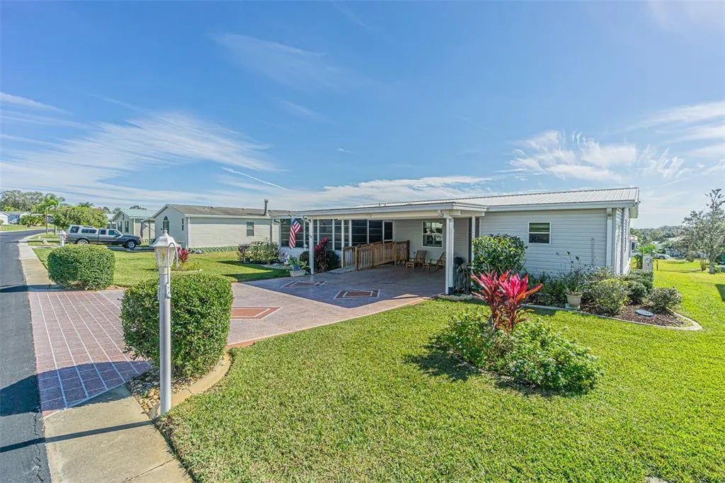 NEW HORIZONS in SUNNY FLORIDA...FURNISHED HOME in GATED GRAND HORIZONS is READY for new Owners! Park Side by side in your Covered carport with Decorative finish. Oval leaded glass door welcomes you into the Foyer... Notice the attention to detail in this Architecturally pleasing home with Fluted columns, Arches, Etched glass accents plus Crown Molding. Archway to Dining Area which is OPEN to the kitchen and LARGE Great Room with Transom windows and Plantation shutters. Gorgeous kitchen with GLEAMING GRANITE counters, Breakfast bar and Center island accent the Wooden cabinets. Owners retreat is AMAZING with Bath ensuite boasting soaking tub, dual vanities plus separate shower. Access door to SECOND ENCLOSED FLORIDA ROOM which has a STEP IN Therapeutic tub AND a hot tub/spa. Room for a desk, office area or CRAFT area to quilt or sew. Exit door at the rear opens onto a new back DECK with railings to enjoy the Sunny Florida winters with a good book or just relax and listen to the birds serenade you! Split bedroom plan has secondary guest bedroom and bath on the opposite end of the home for privacy. Double doors off the Foyer OPEN to a 3rd bedroom with a large closet, now used as a den with a sleeper sofa for guests. At the front of the home, a Wooden Ramp off the carport leads to the Front Enclosed Florida room where you can entertain neighbors and Dine casually with light, bright views of the front landscape and down the street. OWN YOUR LAND in this 55+ Community which has RESIDENT OWNED Amenities: Clubhouse with Commercial grade Kitchen, Library with movies, puzzles & games, Craft/Sewing/Quilting room, Stage for HOA meetings and BINGO, Plenty of parking, Heated POOL and Hot Tub, Shuffleboard, Bocce, Cornhole, Billiards room, Planned activities, On site Entertainment events and Travel Excursions! Come and Live the Florida Lifestyle... CALL TODAY!