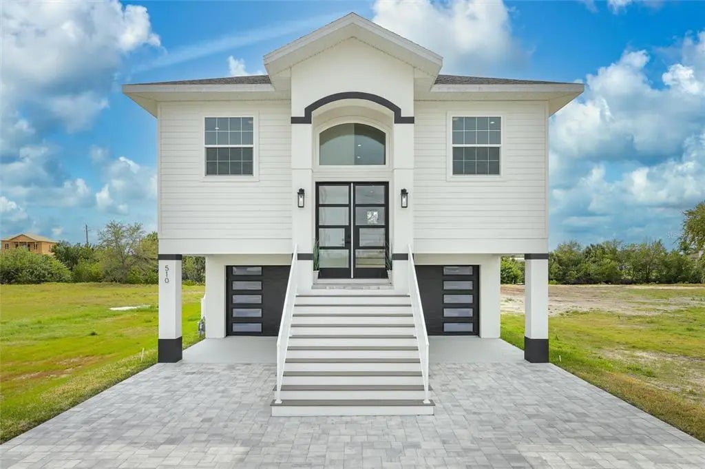 The first of 11 newly constructed custom waterfront dream homes. This brand new Waterfront Custom Key West Style pool home boasts 2,248 SqFt of living space, featuring 4 bedrooms and 3 full bathrooms all on the second level above a massive 1,408 SqFt 4-car garage. Sitting on an oversized 9,000 SqFt lot and the only home on Estuary Shore Ln with its own dedicated PRIVATE DRIVEWAY. You enter the home to captivating 10ft ceilings, with 8ft interior doors providing a custom touch throughout the entire home. Waterproof luxury vinyl flooring will run seamlessly throughout the wide open floor plan. The dream kitchen features 42in shaker style cabinets with soft closing hinges, and stunning quartz countertops with matching backsplash providing that Wow Factor. The huge kitchen island boasts an elegant waterfall edge counter, sitting as a focal point of the kitchen providing a great space for entertaining. This dream kitchen comes complete with a brand new set of high end Stainless Steel appliances. The master bedroom is a true retreat with a massive walk-in closet and private access to the expansive balcony with immaculate views. The spa like en-suite features a dual sink vanity, huge stand up shower with custom glass enclosure, and a relaxing soaker tub. One of the most unique aspects of this brand new custom build is the massive 1,408 SqFt garage. There are so many ways you can utilize the space from storage for all your toys and cars, to a home gym, movie theater, game room, Etc. The options are endless for this space that you will not find in any other home. With the living space elevated above the garage you will take comfort in knowing your family and possessions have added protection from any storms, and you will realize a substantial savings each year on any flood insurance policy. There are multiple outdoor spaces including the balcony and huge 640 SqFt downstairs patio where you will create life long memories entertaining friends and family. You can take comfort in knowing the home comes with a 2/10 bonded builder warranty as well. Unlike most new homes in the area, this custom new build does not require any CDD or HOA fees amounting to thousands of dollars in savings each year. The home features the most ideal water access with no fixed bridges so you are just minutes away from boating in Tampa Bay. Wether you want to reel in an inshore slay surrounded by world renown fishing, paddle board throughout the expansive waterways in Apollo Beach, or just soak in some rays in the Sunshine State by the pool, this brand new home offers the opportunity to live the true Salt Life.