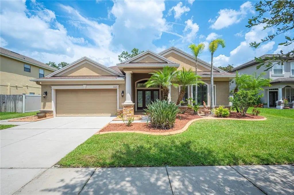 One or more photo(s) has been virtually staged. WELCOME HOME! As you approach, you'll be greeted by impeccable curb appeal featuring beautifully landscaped grounds, elegant stone accents, and a striking glass front door with oversized sidelights. Step inside the grand foyer and be captivated by the spacious living and dining areas, one of the front rooms offers the potential to be converted into a large office, providing versatile space tailored to your needs. Both spaces adorned with trey ceilings, abundant natural light, art niches, and a charming bay window. The kitchen is a culinary dream with 42-inch maple cabinets and granite countertops, seamlessly flowing into a generous Grand room and breakfast nook. The Primary suite offers a retreat-like experience with gleaming wood floors, a walk-in closet, and a trey ceiling. The luxurious Primary bath boasts a garden tub, dual sinks with cultured marble tops, and a separate shower. Two additional guest rooms, also featuring wood floors and ceiling fans, are thoughtfully situated away from the master suite for privacy. Entertain with ease in your private, fenced backyard through thermal French doors, or relax in the screened lanai. This home is perfect for gatherings and everyday living.