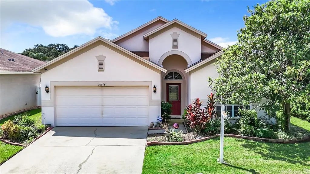 Discover this practical four-bedroom Meadow Pointe home located in the gated village of Ammanford in the heart of Wesley Chapel. This 2080 square foot home offers convenient access to nearby schools, shopping centers, hospitals, and entertainment venues, making it an ideal choice for first-time home buyers. As you step into the entry hall, you're greeted by niches on the wall that add a touch of character to the space. The eat-in kitchen features 42-inch cabinets and a pantry, providing ample storage space. An inviting breakfast bar opens to a tiled great room, perfect for casual meals and family gatherings. The house includes a formal living room and dining room combination, providing a flexible space for various activities, from hosting guests to relaxing with family. The primary bedroom boasts sliding glass doors leading to the backyard and an ensuite primary bath equipped with a Jacuzzi tub, walk-in shower, dual sinks, and a walk-in closet, offering both comfort and practicality. One of the standout features of this property is the planned replacement of the original roof and air conditioning unit before closing, ensuring peace of mind for the new owners. The water heater was replaced in 2019. Situated in Wesley Chapel, the neighborhood offers a welcoming and family-friendly atmosphere. Easy access to major roads makes commuting straightforward. The proximity to essential services and leisure activities enhances the appeal of this home, providing a balanced lifestyle for its future residents. In summary, this well-located and thoughtfully designed house at 30518 Lanesborough Circle is a great opportunity for first-time home buyers looking for a blend of comfort, convenience, and community in Wesley Chapel.