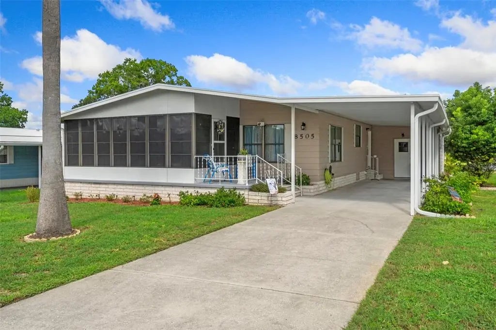 Discover the charm of this spacious 1404 sqft home, nestled on a beautiful lot. Built in 1987, this home has been meticulously maintained. The vaulted ceilings and new floors in most rooms create an inviting atmosphere, while the enclosed Florida room provides a serene space to relax. Inside, you'll find a convenient laundry room with built-in desk. The spacious kitchen features refaced kitchen cabinets, lot of counter space and storage and a cute breakfast bar/nook overlooking the living room. The master suite boasts a new shower and tons of space with large vanity and dual mirrors, plus a huge walk-in closet which offers ample storage. The guest bedroom features two closets for added convenience. Washer and dryer are included with the home, making moving in seamless. Located in GATED 55+ community where you OWN YOUR OWN LAND and enjoy amenities like heated pool, tennis, golf course, shuffleboard, community center and lots more! DON'T MISS OUT! Call now to schedule your showing today.