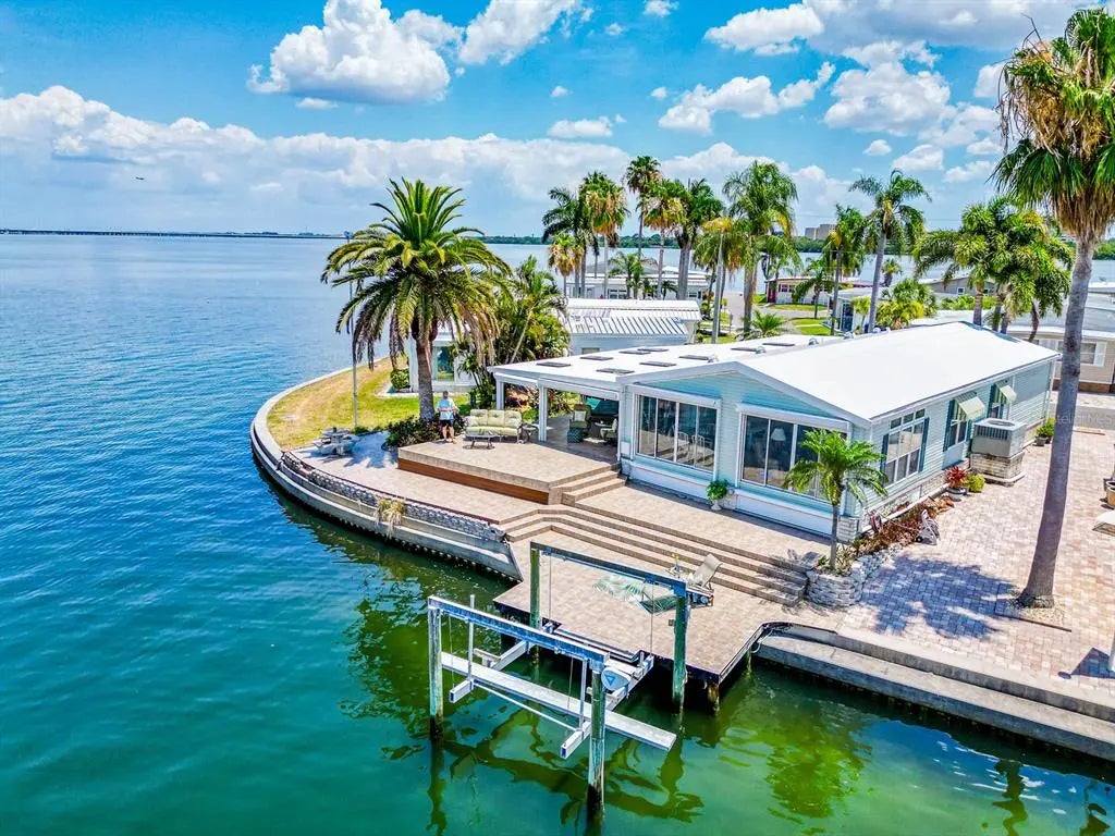Experience the ultimate in waterfront living with this exquisite Clearwater home in Bay Aristocrat Village, where every detail is designed to offer comfort, luxury, and breathtaking views. This beautiful property features a spacious 2 bedroom, two bath layout with an additional den. As you step onto the expansive covered patio, the water views and the ocean breezes immediately captivate your senses, offering stunning views of the glistening waters that stretch as far as the eye can see. Inside the home, the thoughtful layout places all bedrooms to the left, while the kitchen and main living areas are to the right. An open-concept design seamlessly connects the living room and kitchen, creating an ideal space for gatherings and entertainment. Large glass sliding doors allow for unobstructed views of the water flooding the living spaces with natural light and majestic views of Tampa Bay. Natural light pours in through skylights, illuminating the interior with a warm, sun-kissed glow. The owner’s suite, situated at the back of the house, boasts a comfortable bathroom designed for tranquility and convenience. The guest bathroom is conveniently located just steps away from the guest bedroom, ensuring comfort for visitors. The versatile den, enclosed with beautiful French doors, can serve as a cozy reading room, a craft room, or even an additional bedroom, depending on your needs. The outdoor space of this property is impressive and it exudes coastal charm and Florida living. Wether you want to sit back relax with a glass of wine or start your day with a cup of coffee watching spectacular sunrises over the bay, the covered patio is the perfect relaxation sanctuary to enjoy dolphins, manatees and exotic birds year round. Additional amenities include a beautiful terrace, gardens, paver covered carport, a spacious shed with skylights, ample under-home storage, and automated hurricane shutters for peace of mind. This waterfront gem in Bay Aristocrat Village offers the perfect blend of comfort, style, and functionality, making it an ideal retreat for anyone looking to enjoy the best of Florida living. Roof (2022) HVAC (2013) Refrigerator (2020) Dishwasher (2019) W/D(2020) Property comes furnished. The vibrant Bay Aristocrat Village community offers resort-style amenities, including a heated pool, hot tub, clubhouse, shuffleboard courts, pavilion, and two private fishing piers just steps away. Whether you’re looking for a second home or a full-time residence, this property provides a perfect slice of Florida paradise. The location couldn’t be better, there are so many local restaurants with live music & fun activities along with Hospitals, stores & shopping nearby with everything you could ever need just off US Hwy 19. Clearwater Saint Pete airport is only 10 mins away, Tampa Airport 20 mins, 20 minutes to the beautiful sandy gulf beaches and quaint famous towns like Belleair, Safety Harbor and Dunedin are only a short drive away. Come put your personal touch on this beautiful home…Paradise Awaits! Dock and lower deck suffered damage from storm and is in the process of waiting repaired.