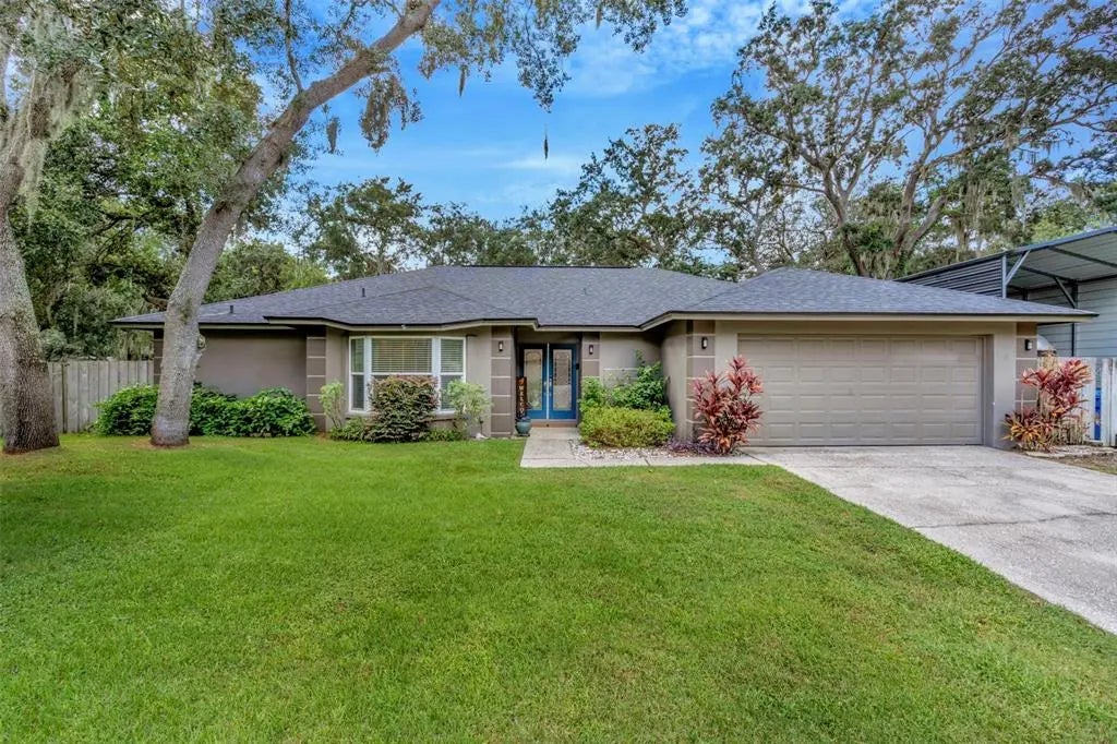 Welcome to 3923 Applegate Circle, a 3-bedroom, 2-bathroom, 2 car garage, block construction, non-flood zone, heated saltwater pool and spa home nestled under the canopy of beautiful oak trees. This residence also offers a 16 foot tall, 46 foot long covered RV or boat port with 30 amp power. Natural light pours in through the oversized windows and the herringbone tile flooring throughout adds a hint of luxury to every room. The kitchen is a culinary enthusiast's dream, featuring a high end stainless steel Samsung appliance package complete with a natural gas range (2023), luxurious Kraus sink and faucet (2024), Moen garbage disposal (2024), complimented by a seamless granite countertop and backsplash, ceiling height cabinetry, pot filler, and pass through windows making indoor outdoor entertaining a breeze. Other updates include recessed LED halo lighting (2024), shingle roof (2020), roof clips added (2022), custom laundry room cabinetry with a butcher block countertop (2024), top of the line Samsung washer and dryer (2024), whole house water filtration system, a Rinnai tankless gas powered hot water heater, lavish lighting fixtures and ceiling fans (2024), blown in attic insulation (2024), primary bathroom updates (2024), fencing (2023), custom closet systems (2023), custom closet doors (2023), and so much more! Outdoors, enjoy the Florida sunshine in your private oasis. The PebbleTec pool and spa (2020) offer a perfect retreat for relaxation, while the expansive private outdoor space is ideal for entertaining guests or enjoying quiet moments. Smart features include a brand new Hayward Omni Plus pool automation system (2024), Honeywell Home HVAC control, and a Kwikset smart lock. No HOA or CDD. This property is truly one of a kind. Your dream home awaits! Call today!