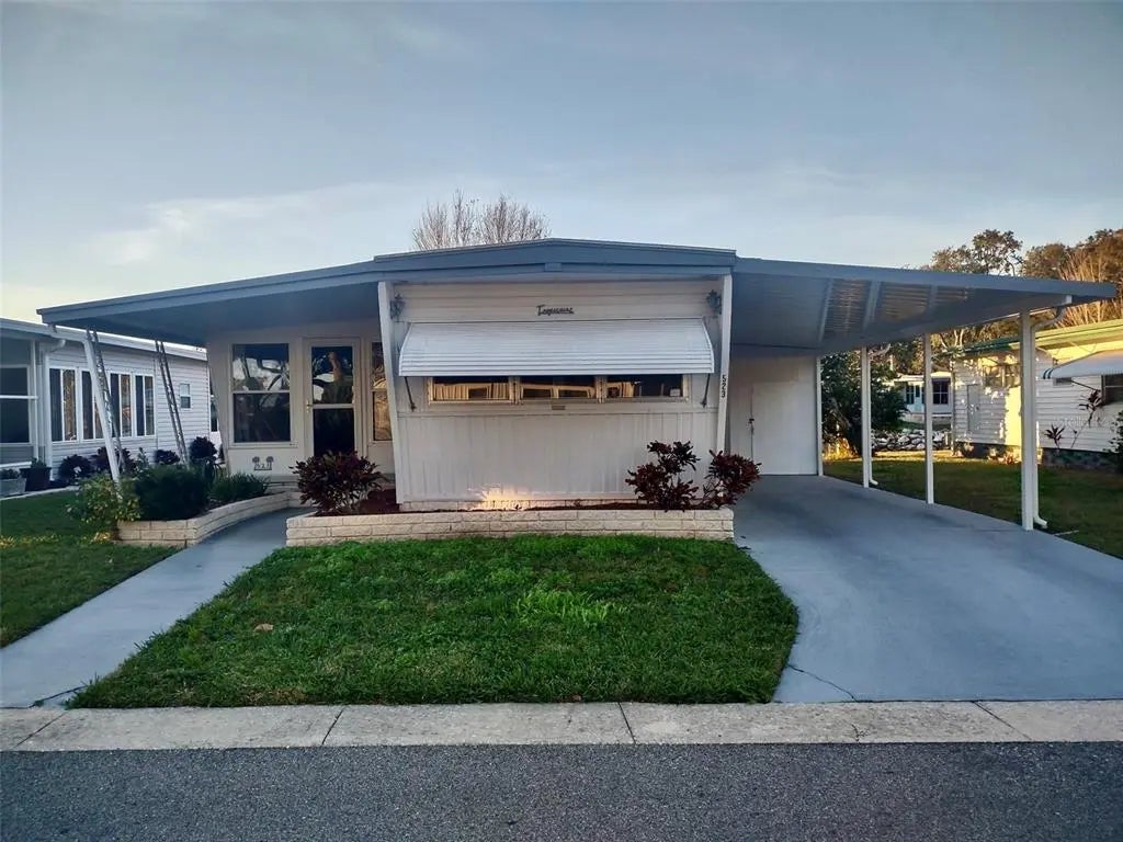 Welcome to Country Park a RESIDENT OWNED, 55 years of age and older community. One bedroom one bathroom home is well maintained and freshly painted with recently installed luxury vinyl flooring. Complete with a nice living room and a spacious Florida room. The full bathroom that includes a bath tub and shower combo is conveniently located which allows access from the hallway for guests, and a private entrance to the master bedroom. This home also features a nice view of the pond located at the rear of the property. A roof over was installed in 2018 and a new central heat and air conditioning unit installed in 2024. The washer and dryer are located in the shed under the carport. The H.O.A. Fee is only $260.00 monthly and includes Water, Trash, Lawn Maintenance, Heated Swimming Pool, Clubhouse, Billiards Room, and Shuffleboard. This home is located within a short drive to shopping, dining, and the beach.
