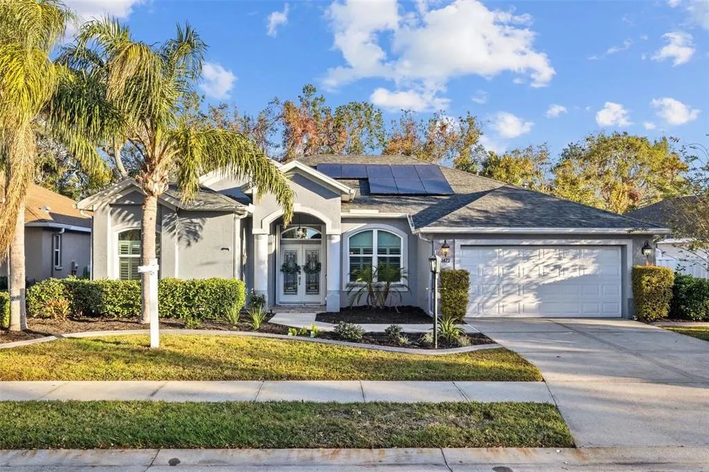 One or more photo(s) has been virtually staged. Experience luxury living in this stunning 4-bedroom + office, 3-bathroom pool home, nestled in a sought-after golf community and fully powered by solar energy. With over 2,300 square feet of thoughtfully designed living space, this home effortlessly combines comfort, modern elegance, and sustainability. From the moment you arrive, the beautifully landscaped front yard and welcoming entryway set the tone for the sophistication within. The open-concept floor plan is bathed in natural light, featuring a warm color palette and stylish finishes throughout. The spacious living room, with oversized sliding doors and a cozy breakfast nook, flows seamlessly into the formal dining area—perfect for intimate dinners or lively celebrations. At the heart of the home is the gourmet kitchen, a chef’s dream, complete with stainless steel appliances, custom cabinetry, Cambria quartz countertops, a generous peninsula with bar seating, and a custom butler’s pantry. Adjacent to the kitchen, the casual dining area and family room open to a covered patio, offering the perfect setup for indoor-outdoor living. The luxurious primary suite is a serene retreat, boasting custom walk-in closets by Closet Factory and a spa-like en-suite bathroom. Pamper yourself with dual vanities, a stand-alone soaking tub, a rain head shower with a full-body system, and a built-in towel warmer for added comfort. Three additional bedrooms are generously sized, with easy access to two beautifully appointed bathrooms, ensuring privacy and convenience for family and guests alike. Step outside into your private oasis, where a sparkling heated saltwater pool and lushly landscaped backyard with fruit trees await—all backing up to peaceful private preservation land. Additional highlights include: • Customized laundry room with Closet Factory finishes and stackable washer/dryer • Whole-home solar power system (2021) • New roof (2020) • Top-of-the-line air conditioner (2022) • Updated electrical panel with surge protection • Generator with built-in transfer switch • Hurricane-impact windows and sliding door shutters (2021) • Reverse osmosis system and newer water softener • Updated pool equipment, including a new automatic cleaner With low HOA dues and no CDD fees, this exceptional home is conveniently located near The Links at Greenfield Plantation Golf Course, top-rated schools, shopping, dining, and recreational amenities. Offering an unparalleled blend of style, comfort, and modern living, this home is a rare find. Don’t miss your chance to own this extraordinary property—schedule your private tour today!
