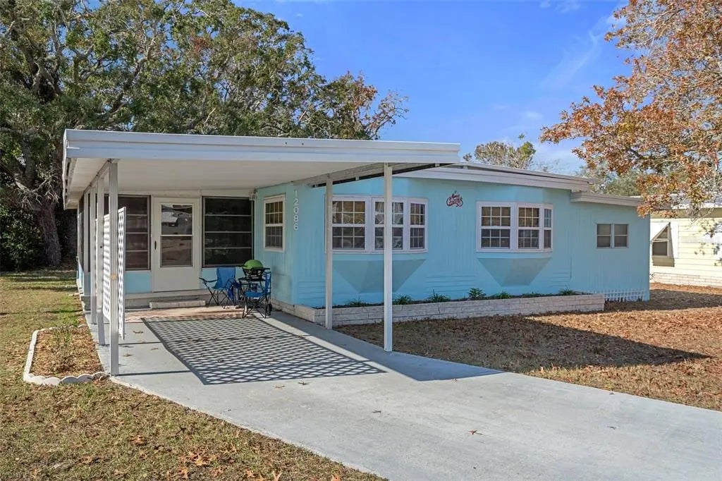 This BEAUTIFULLY RENOVATED and FULLY FURNISHED, INCLUDING THE GOLF CART!, 2-bedroom, 2-bathroom home is NESTLED ON THE GOLF COURSE in the highly sought-after 55+ High Point Community where YOU OWN YOUR OWN LOT. Move-in ready. Offering an LIGHT & BIGHT, OPEN FLOOR PLAN with modern finishes throughout, updated kitchen and bathrooms, flooring, enclosed lanai, and extra storage for a golf cart. A TRUE GEM for those seeking a peaceful yet active lifestyle. High Point is a very active community with golf, bocce, heated pools, horseshoes, and so many social activities . Low HOA fees make it very affordable.