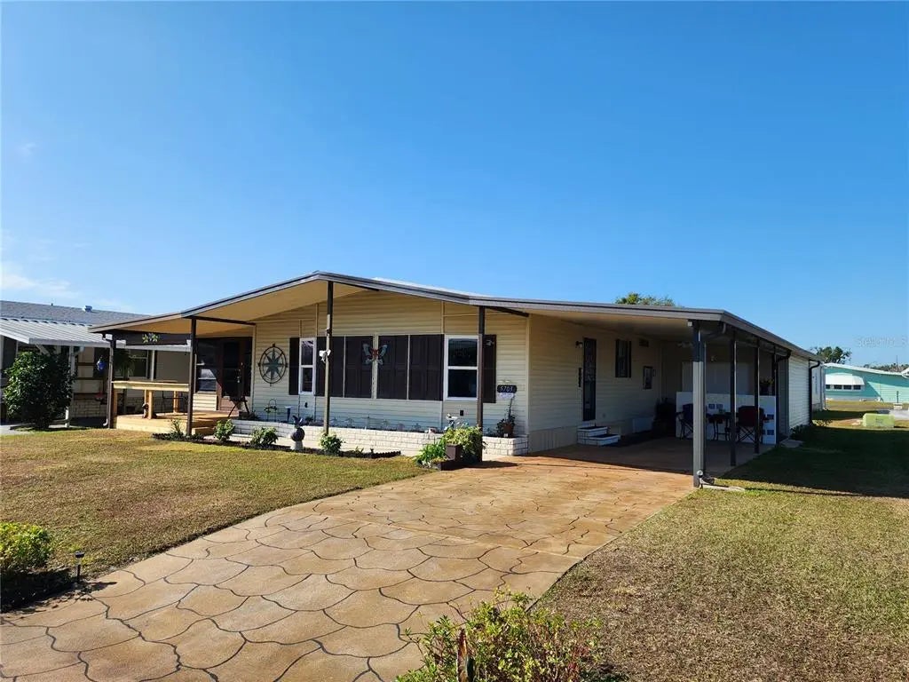 Check out this beautifully updated home in Betmar Acres. It has been refreshed with an updated rubber roof, double pane windows, new paint, upgraded light fixtures, ceiling fans and flooring throughout. Upon your arrival at the property, you are greeted by a decoratively painted driveway, Florida-friendly landscaping & a garden area with southern exposure which is a perfect spot for growing your own vegetables. There is generously sized carport with a removable block privacy wall at the end, creating a private space for the portable hot. tub. There is also a large, attached utility room with a washer/dryer, an extra refrigerator, ample storage space with shelving, and a double door to park your golf cart. At the front of the home is a wide overhang with sidewalk, brick planter and a new raised covered deck/greeting porch with roll down sunshade. Entering through the Florida room You will love the accent wall and appreciate the portable AC which could make the Florida room perfect for a guest sleeping area. A sliding glass door brings you to the Living room which features a cathedral ceiling giving a nice open feel. This home provides an open concept living room that is open to the dining area & kitchen. Theres a built-in hutch with glass doors for displaying your cherished items. The kitchen boasts a decorative tile backsplash, 2 pantries, a ceiling fan, ample cabinetry & counter space for storage & cooking, plus a dishwasher, garbage disposal, microwave, & stainless-steel stove & refrigerator. Just off the kitchen and down the hallway you'll find an additional closet & the completely renovated main bathroom with its own storage closet, updated vanity with undermount sink, upgraded lighting, mirrored medicine cabinet & a low-step walk-in shower, it is conveniently located just across from the second bedroom. The second bedroom is spacious with plenty of room for a king-size bed and features a dual closet with mirrored doors. At the end of the hallway you'll find the primary bedroom suite, it's very spacious with plenty of room for a king-size bed and seating area if desired. The primary bedroom has a large walk-in closet & two-part en-suite bathroom featuring a separate walk-in shower area, built-in linen cabinet, updated vanity with undermount sink, & a spectacular crystal light fixture. No attention to detail has been missed. This lovely home is being sold completely furnished including all major appliances. Located in Betmar Acres, an active and friendly 55+ community where you own your land. No Lot Rent! and low annual dues of $435.00 make this home an attractive option for those seeking an active lifestyle in a vibrant community. Betmar Acres offers lots to keep you busy including, Bingo, dances, three 9-hole golf courses, 2 swimming pools, 2 hot tubs, Bocci ball, mini golf, horseshoes, indoor shuffleboard courts, park library, pickleball, tennis, 3 clubhouses, cards, billiards & darts and more. Schedule your appointment today, this one won't last long!