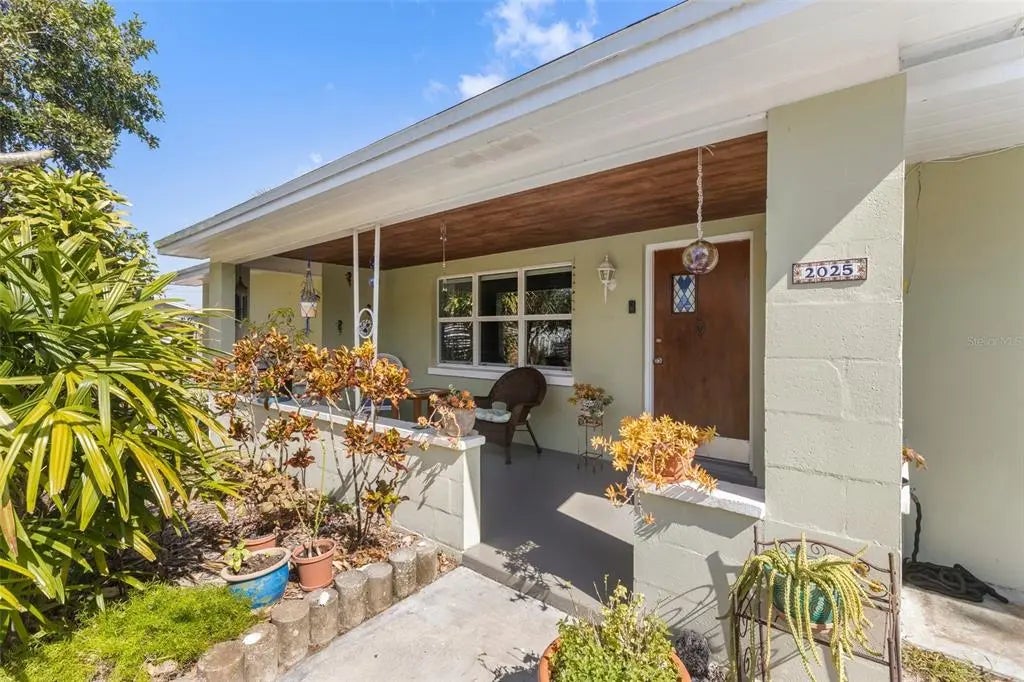 Your hunt is over, we have found you your dream Florida retreat, hidden away on the pretty Plaza Dolores cul-de-sac. This sturdy '50's concrete block home welcomes you in via a shady front porch from where to enjoy the birds and bees in the colorful front yard. The interior of the home enjoyed extensive renovations and upgrades in recent years including windows, floors, kitchen and bath and 2024 roof. Notice the original hardwood flooring upon entry. The spacious living room flows into the fabulous eat in kitchen with stainless appliances, granite counters and ceramic plank flooring. To the rear of the home is a brightly lit windowed porch from where to enjoy the spacious back yard or have a quiet relax. A large rear deck in the fenced yard provides additional entertaining area accessed from the rear porch and garage. With a prime location adjacent to the Pinellas Trail and a few blocks to the vibrant downtown of Dunedin or a short bike ride to downtown Clearwater. With ease of access to beautiful beaches, golf, baseball, art, breweries and restaurants, concerts, parks and marinas the area offers something for everyone. Whether you're seeking an idyllic full-time residence, a seasonal getaway, or a high-demand rental property, this sought-after "Clear-Dun" location presents an excellent opportunity. With no flood insurance required and no damage from recent storms, this home offers peace of mind and an enviable lifestyle. It's a leisurely stroll down to nearby Edgewater Linear Park to watch frolicking dolphin and marvel at the glorious sunsets over the shimmering waters. Please visit soon and make this home your own!
