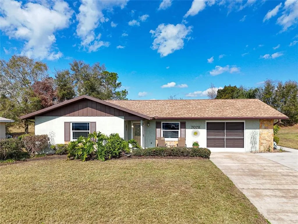 SEEIN' IS BELIEVIN'! This immaculate 2/2/1 home has amazing curb appeal! Beautifully landscaped and featuring an almost new roof, this beauty invites you to take a look. The covered entry features a storm door combined with a beautifully crafted entry door. Once you're inside, you'll step onto luxury plank vinyl flooring and will be surrounded by beautiful tropical decor. The formal living room on the right is open meaning it's "Florida formal!" The tropical touches thruout the home, inside and out, will remind you that this is a great place to be. While dining in the dining area or at the handy kitchen counter, you can enjoy great outdoor views. The Florida room says "Come relax!" The outdoor patio, complete with fire pit, is perfect for grilling, catching the sun and more! Roomy inside laundry room with an extra refrigerator and all 3 appliances are included. The 2 bedrooms are beautifully appointed. The front (primary) bedroom has a spacious walk-in closet and private bath with shower. The roof is "4 years new," and a BRAND NEW HVAC system was just installed on 02/25/25! The attached 1 car garage is oversized - it's 17' X 18'!!! So there's more storage than you can imagine! Now ..... here's the icing on the cake! The seller is offering this wonderful home "toothbrush ready!" Almost all furnishings, dishware, linens, tools in the garage, etc. will be included for the lucky buyer OR if you don't want/need any or all of these items, they can be removed! A list of available items will be provided. And ... if you are a traveler, this home is located just a couple of minutes from the intersection of Cortez Blvd. (State Road 50) and I-75, 20 minutes from downtown Brooksville and 30 minutes from Florida's famous Gulf beaches, very close to Rails to Trails, the Sherman Hills golf course, Silver Lake, shopping, medical facilities, restaurants and so much more! ALL THIS WAITING FOR YOU For just $265,000!
