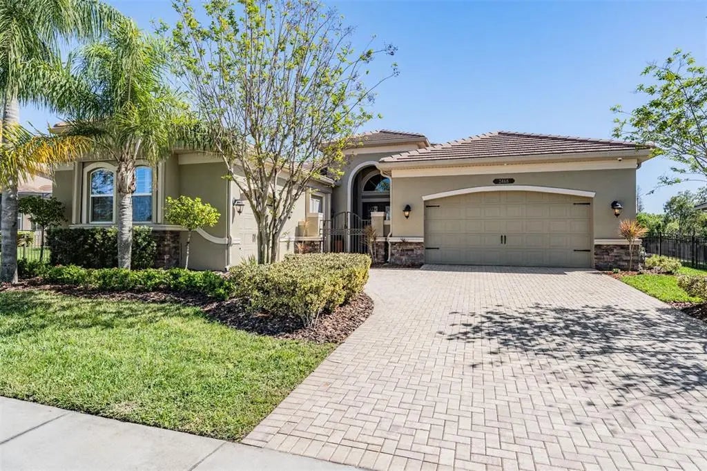 Welcome to 2468 Coco Palm Circle, a luxurious Carlyle model by GL Homes in the sought after Ridge at Wiregrass Ranch. This meticulously upgraded property offers 3,460 square feet, 4 bedrooms, 3.5 bathrooms, plus additional entertaining spaces and sits on an expansive 0.27 acre conservation lot with fresh landscaping, offering ultimate privacy and resort style living. Step through the gated courtyard and enter through cut glass double doors into a grand 16 ft coffered ceiling entryway with a custom mirrored feature wall. The great room showcases rich wood floors, a painted stone feature wall, built in surround sound with subwoofers, and panoramic sliding glass doors framing breathtaking pool and nature views. The gourmet kitchen is a chef’s dream, featuring quartzite countertops, custom soft close cabinetry with pull out shelving, an upgraded refrigerator, microwave, and dishwasher, plus a gas cooktop, double ovens, and a stainless steel hood. Entertain in the formal dining room or at the full wet bar, complete with custom cabinetry, a wine cooler, and a beverage refrigerator. The primary suite is a private sanctuary with motorized blackout shades, a coffered ceiling, built in surround sound, and private lanai access. A private hallway leads to dual custom walk in closets and a spa-inspired bath with granite topped vanities, a soaking tub, and a large glass enclosed shower. Beyond the primary suite, the home offers versatile additional living spaces. The club room, equipped with built-in surround sound and AV equipment, is perfect for a media space, home office, or entertainment area. Additionally, the connected hobby room offers a quiet retreat for creative projects or can easily serve as a fourth bedroom. Combine the two and you have a wonderful retreat for guests. There are two additional bedrooms, one with an en suite bathroom, and one with a built in Murphy bed and desk area, along with a well appointed laundry room with full cabinetry, that adds to the home’s thoughtful design. Step outside to the 800 sq. ft. covered lanai, equipped with motorized screens, a built in gas grill, storage area, and a 60” TV. The 47-ft heated saltwater Pebbletec lap pool features vessel fountains, a sun shelf, and marble pavers, all set within a fenced backyard with anti-critter protection. Additional upgrades include a Generac full-home generator, hurricane window coverings, central vacuum, an Air Knight PX5 air filtration system, and a full security system with four cameras. Residents of The Ridge at Wiregrass Ranch enjoy resort style amenities, including multiple pools, a waterslide, fire pits, lighted tennis courts, a fitness center, sports courts, a playground, and a full time gated entrance. Conveniently located minutes from top rated schools, fine dining, shopping, and major interstates, this home offers an effortless commute to downtown Tampa and Tampa International Airport. A home of this caliber, elegance, and exclusivity is truly a rare find. View the 3D walk thru here https://show.tours/e/hqdCkDs