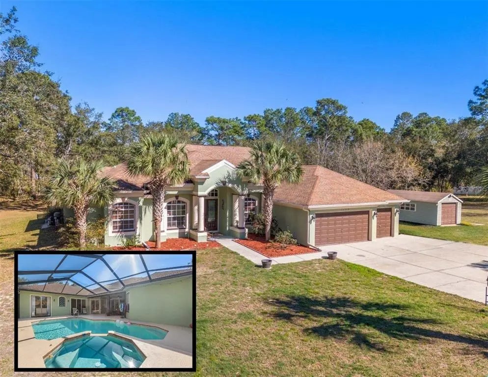 Be prepared to be mesmerized with this stunning, multi-generational, custom Windjammer home to fit all your needs! Situated at the end of a no-through road, you will find 2 acres, fully fenced with a gorgeous, Stratford model home, showcasing 5 bedrooms, one of them a Mother-in-Law suite w/attached sitting room, 4 1/2 bathrooms, an office, a pool & a heated spa. You will be in love as you walk through. Tucked inside the peaceful neighborhood of the Royal Highlands of Weeki Wachee, this home is close to all amenities, but screams seclusion! Pulling up, be in awe of the curb appeal, oversized driveway & fresh exterior paint (2025). Walking inside, the grand foyer opens to all formal living spaces, filling the home w/ample natural light. Off the grand foyer is a generously sized office space, that could easily be transformed into another bedroom, a gym or a nursery. The possibilities are endless. The formal living room & dining room, have crown molding, high ceilings & tile floors. Tucked on one side of the home, for ideal privacy, is the massive owners retreat, w/access to the pool, 2 walk-in closets, an attached en suite bathroom w/double vanities, a shower & soaker tub. Outside the owners room is a half pool bath. Through the living spaces, you will be lead into a culinary lovers dream kitchen- featuring maple cabinets, granite countertops, a center isle w/sink, large pantry, & stainless steel appliances— including a built-in oven & electric cooktop. The oversized family room, opens up to this space, making it a focal point & ideal for entertaining, w/sliders leading you to the lanai & pool area— for true indoor/outdoor living! This space also has a fireplace, crown molding & loads of natural light. On the back side of the home, sits the Mother-in-Law suite w/sitting room and attached en suite bathroom. This is a great place for the in-laws or visitors, since they have their own privacy and entrance! Down the hallway, along one side of the home are two more spare bedrooms, w/a full bathroom, & extra closet space. The last wing of the home features a large laundry room, another oversized spare bedroom, w/attached en suite bathroom & walk-in closet. This home has amazing privacy for all! Out back, the covered lanai overlooks the serene pool, w/plenty of space to enjoy the Florida sun or relax in the shade. There is a heated spa, for those cooler nights & a lot of great space for grilling & activities. You will also find an over sized shed, for additional storage and toys, a chicken coup & two outdoor fire pits! The 2 acres is a park-like setting, meticulously cared for and has so much potential for any Florida lover, there are flower beds for growing your own produce, too! Other great features? Newer A/C units (2018), newer pool pump (2023), electric water heater (2024) and garage floor was just painted (2025). Other great bonuses? Home has a ring doorbell with cameras around the outside and on shed, for extra security! With no HOA or CDD fees and flood zone X, this home won't last long! Call today for a private showing!