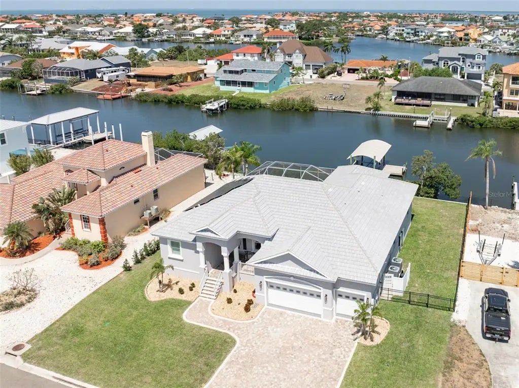 Welcome to this well-maintained, energy-efficient waterfront pool and spa home, offering 100 feet of deep-water frontage and a spacious three-car garage! Constructed with Insulated Concrete Forms (ICF), this home delivers superior durability, energy savings, and enhanced soundproofing. Inside, a wide foyer opens to a formal dining and living area, leading to the family room perfectly situated off the kitchen. The kitchen features granite countertops, upgraded stainless steel appliances, 42” cherry wood cabinets, a walk-in pantry, and breakfast nook. The back of the home faces west so you will enjoy nightly sunsets from nearly every room in the home, with a large panoramic window at the breakfast nook designed to maximize stunning waterfront and sunset views. Tile flooring runs throughout the main living and wet areas, while newly installed hardwood flooring adds warmth to the bedrooms. The owner's suite, located separately from the secondary bedrooms, includes custom walk-in closets, Hunter Douglas blinds, private patio access, a garden tub, dual sinks with granite countertops, and a large walk-in shower. Car enthusiasts will appreciate the oversized garage, complete with tall ceilings, a vehicle lift to store your collectible or hobby car, and newly finished floors with a high-durability Polyaspartic coating system. The home is equipped with a Powerwall, storing energy generated by solar or the grid, ensuring seamless power maintenance — and notably, the home has NEVER flooded due to its higher elevation or lost power due to the Powerwall backup system. Step outside to a west-facing patio with a fully screened pool, heated spa, paver decking, and a covered seating area. The dock includes a 10,000 plus lbs. boat lift with new bunks and a permanent canopy for weather protection. Additional features include a 2018 HVAC system and an exceptional Apollo Beach location offering deep-water access with no lifts or bridges to Tampa Bay. Save your money with this home since this home has NO HOA or CDD fees and the higher elevation resulting in a low flood insurance rate which can be grandfathered to a new buyer. Convenient to Highway 41, I-75, shopping, dining, entertainment, and St. Joseph's Hospital. Don't miss this rare opportunity to own a truly exceptional waterfront home!