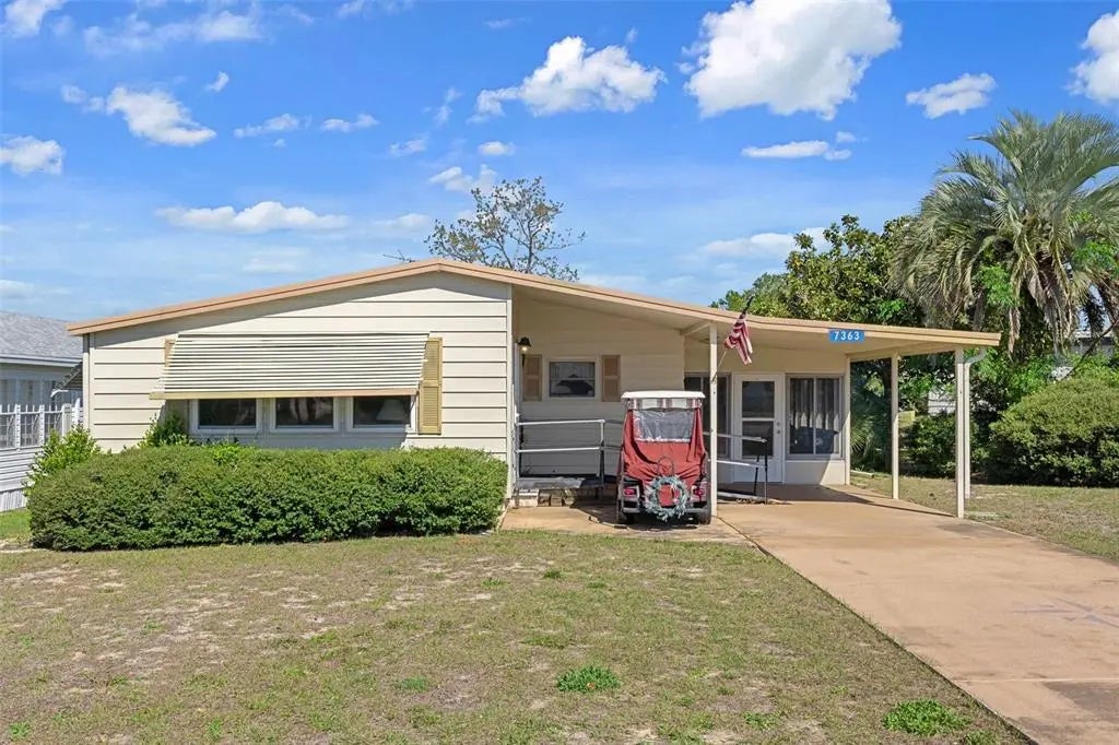 Welcome to the desirable High Point 55+ Golf Community where you OWN THE LAND!! This 2-bedroom, 2-bathroom home offering 1,152 sq. ft. of comfortable living space. This property features a spacious and inviting living room, perfect for relaxing or entertaining guests. The large master bedroom includes its own ensuite bathroom, offering privacy and convenience. One of the standout features of this home is the glassed-in Florida room, providing the perfect spot to enjoy the outdoors all year round. Additionally, the sunroom adds even more living space, ideal for a cozy retreat or a bright, airy dining area. The home is equipped with dual pane windows throughout, ensuring energy efficiency and a quiet, comfortable atmosphere. This home is full of potential but will need some TLC. With a little sweat equity, this property could be transformed into your very own retirement haven at a fantastic price! Whether you're enjoying your morning coffee in the sunroom or relaxing in the Florida room, this home offers the ideal combination of comfort and charm at a price that allows you to add your personal touch. Located in desirable High Point area, this home is a wonderful opportunity for those looking to invest in a property with great potential. Embrace an active retirement with over 40 clubs to join, dance and exercise classes, horseshoe pits, tennis courts, pickleball, shuffleboard, bocce, and the heated pool at the Clubhouse! If you enjoy Golf, join the Golf Club and enjoy Florida's beautiful weather on the 18-hole Golf Course. Close to shopping, restaurants, entertainment, and medical facilities.
