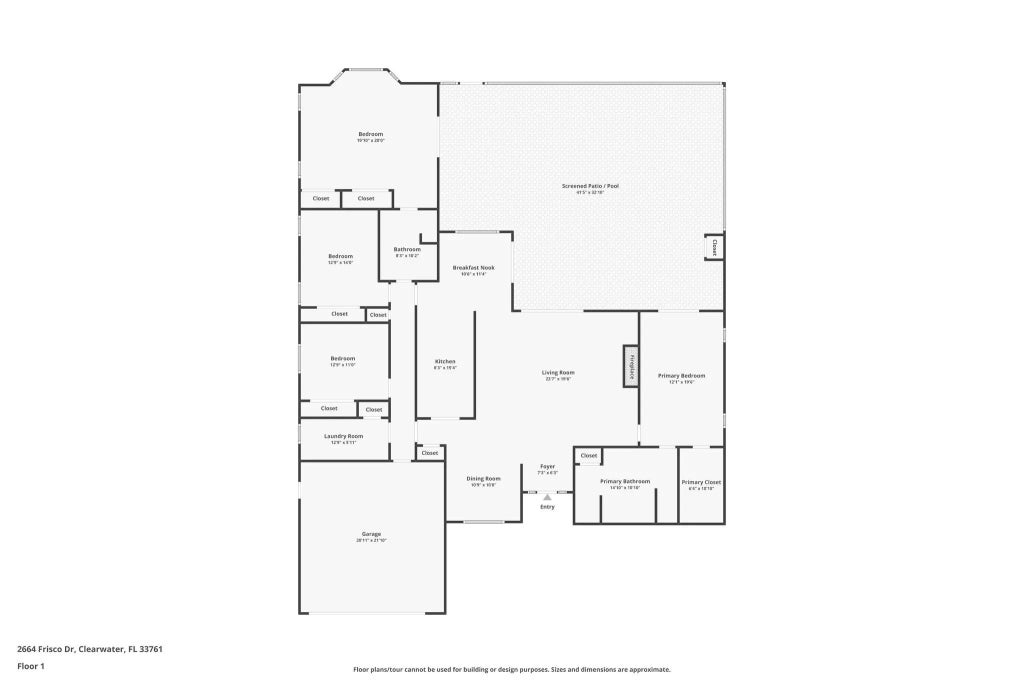 One or more photo(s) has been virtually staged. Welcome to 2664 Frisco Dr, a ranch-style home nestled in the Clearwater area. This property offers the perfect blend of comfort, style, and functionality, with 2,547 sqft of living space, four bedrooms, two baths, a two-car garage, and a generous-sized swimming pool. Upon entering, you'll be welcomed into the spacious great room, which features hardwood floors, a cozy wood fireplace, and soaring cathedral ceilings with multiple skylights that set a warm, light, and inviting tone. The 3-panel sliding glass doors bring the outdoors in, providing seamless access to the backyard oasis. Step outside to discover a fenced-in private retreat with a sparkling pool surrounded by elegant brick pavers—ideal for relaxation and entertainment. The kitchen highlights sleek granite countertops, stainless steel appliances, self-closing drawers, and a generous eating area perfect for family meals. The primary suite is a peaceful haven, boasting a walk-in closet and an en-suite bath with a garden tub, dual vanities, and a separate shower. Three additional bedrooms share a bathroom on the opposite side of the home. This well-maintained property includes fresh interior paint (2025), a new roof (November 2024), a new garage door opener (2024), a new HVAC system (2023), exterior paint (2023), a new pool pump and filter (2023), sprinkler irrigation system and pump (2022), pool resurfacing (2022) and vinyl fence (2018). Experience the best of Florida living at 2664 Frisco Dr—where practicality meets tranquility in a beautifully well-kept home. Don’t miss your chance to own this move-in-ready sanctuary!
