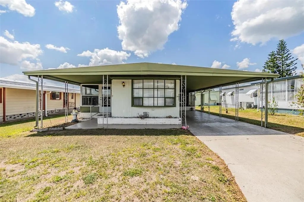 Escape the snowy north and embrace the sunshine in Spanish Trails Village, an active 55+ gated community where you own the land! This well maintained 2-bedroom, 2-bath residence offers the perfect blend of comfort, style, and effortless living—all in a pet-friendly setting that welcomes your four-legged companion. This home offers comfortable and easy living. The open-concept layout seamlessly connects the kitchen and living room, creating a spacious feel perfect for relaxing or entertaining. Vinyl flooring runs throughout the main living areas for easy care and a modern touch. The primary bedroom easily fits a queen-size bed and features a ceiling fan and a large built-in closet. The second bedroom also accommodates a queen bed and includes its own built-in storage and vinyl flooring. You'll find a step-in shower and vanity in the primary bathroom, while the guest bathroom offers a tub/shower combo—perfect for visitors. Off the screened carport, the laundry area includes ample shelving for extra storage (washer/dryer not included). Additional highlights include central A/C and heat, a durable metal roof, and plenty of natural light throughout. All of this comes with a low monthly HOA fee of just $129, granting access to the community’s many amenities. Don’t miss out on your chance to enjoy Florida living at its best—schedule your showing today!