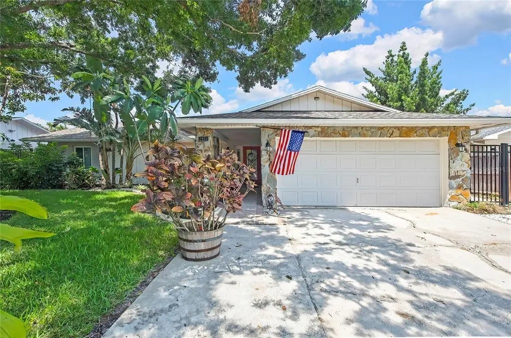 Tucked beneath a canopy of mature trees and nestled in the heart of the desirable Sandpiper neighborhood of Town 'N' Country, this enchanting 3-bedroom, 2-bath, 2-car garage home blends classic charm with thoughtful updates and serene outdoor living. A wide 2-car driveway, framed by lush landscaping and swaying trees, leads to a striking stone façade and a warm, welcoming entryway. Inside, you'll find 1,737 square feet of beautifully maintained, open-concept living space that flows effortlessly from room to room. Built in 1979, this home combines solid construction with stylish modern touches. The main living and dining areas feature elegant wood-grain porcelain wide plank title flooring, creating a warm yet contemporary ambiance ideal for entertaining. French doors off the living room open to a charming paver patio beneath a pergola—perfect for morning coffee or relaxing evenings—framed by a mature, fruit-bearing mango tree that adds a tropical flair to the private backyard. The inviting family room, open to the kitchen, includes sliding glass doors that lead into a versatile screened oversized Florida room for year-round enjoyment, and a layout which offers flexible living space with solid sliding panels—allowing it to become a cozy sunroom during cooler months. The updated kitchen is a true standout with raised panel cabinetry accented by crown molding, sleek Quartz countertops, ceramic tile flooring, a double pantry, a breakfast bar, and a full suite of appliances including a smooth top range, microwave, dishwasher, and French door refrigerator. The spacious primary bedroom is a tranquil retreat, featuring a ceiling fan, a large window overlooking the backyard, and a thoughtfully designed dressing area with a makeup vanity, generous walk-in closet, and ensuite bath. The bathroom showcases a tiled walk-in shower with a stylish Listello accent and a seamless glass enclosure. Two additional bedrooms offer flexible space for guests, a home office, or family needs. Located on a quiet street with no HOA or CDD fees, this home delivers the perfect balance of comfort, functionality, and location—with easy access to Tampa’s major roadways, shopping, dining, and top-rated schools. Don’t miss your chance to own a truly special home in one of Town 'N' Country’s most cherished communities.