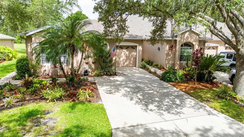 Enjoy golf course living in this beautifully updated 3-bedroom, 2.5-bath Villa located right by the 6th hole-perfect for early morning tee times or sunset strolls in the backyard. Step inside to find custom-built kitchen cabinetry with sleek Quartz Cambria countertops, a chef's delight whether you're whipping up snacks or holiday meals. The open floor plan boasts no carpeting, making spills a little less dramatic and clean ups a breeze. Tile floors flow throughout, including the entryway, lanai, and even the front porch. The tile lanai extends your living space into the outdoors-just right for sipping your morning coffee or relaxing with a good book. The primary bedroom is spacious and thoughtfully designed with an updated walk-in shower and a garden tub. Two additional bedroom and guest bath provide flexibility for family, hobbies, or visitors. Recent updates include a 2023 air conditioning system for year-round comfort, and the community HOA helps simplify life by covering the roof, exterior paint, and private road maintenance. Love your golf cart? It'll have its own garage space or can be used for storage. This villa combines thoughtful updates, low maintenance living, and a prime community location to provide a lifestyle that's convienent and comfortable. Great location near Publix and restaurants. Come take a look-your next chapter might just begin here.