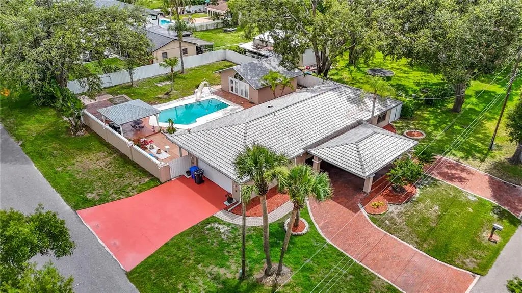 BACK ON THE MARKET! Stunningly transformed in the heart of Carrollwood, this thoughtfully renovated ranch style home offers 3 bedrooms, 2.5 bathrooms, and approximately 1,900 sq. ft. total of living space on a generous 0.29-acre lot. Built in 1973, the property marries classic construction—stucco and tile roof—with modern finishes for style, comfort, and versatility. Main House (3 beds/2.5 bath ~1352 sq. ft.). Fully open floor plan with sleek tile and laminate flooring, keeping the home cool and inviting. Chef’s kitchen featuring quartz countertops, a spacious 6 ft island with soft close drawers, custom pantry, industrial farmhouse sink, and stainless-steel appliances. Nest thermostat and central A/C throughout, Luxurious bathrooms showcasing quality remodels. Detached In Law Suite / Income Unit (1 bed/1 bath, ~720 sq ft) Complete with its own kitchen mirroring the main home’s shaker cabinetry and tile flooring. Ideal for guests, extended family, or a short-term rental opportunity. Outdoor Oasis & Parking. Entertainer's backyard: a spacious deck with fire pit, pool with water features, outdoor shower, gazebo housing a stone detailed grill area (sink, mini fridge, side burner, TV, fan). Room for a boat, RV, or additional storage. Oversized 2 car attached garage plus carport and ample driveway parking. No HOA or CDD, maximizing freedom and flexibility. A rated local K–8 school within the Carrollwood district. A dual-living layout accommodates multi-generational living or rental income. Turn-key-ready finishes with premium kitchen & bath upgrades. Resort-style backyard is perfect for hosting or personal retreat. Exceptional location in a quiet, yet accessible corner of Tampa