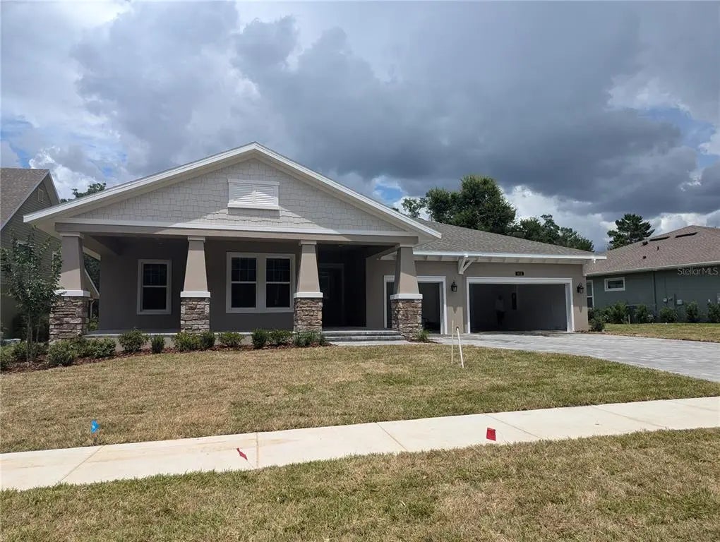 One or more photo(s) has been virtually staged. This beautiful Spire Homes LLC Craftsman 4 bedroom with large bonus room/den(with 5th bedroom or home office) plus 3 car garage is laid out perfectly over 1 story with high ceilings and backs up to a wooded conservation area. Entering the home you are greeted with the highly sought after open floor plan of a large living room (with tray ceiling), dining room, and kitchen. The chef's kitchen features a gas cooktop with hood, built-in convection oven and microwave, soft close real wood white shaker cabinets, quartz countertops, large island with breakfast bar seating, subway tile backsplash, and under cabinet lighting. The home also has a split floor plan with the master retreat featuring a tray ceiling, 2 walk in closets, his/her vanities, plus a frameless shower and separate soaking tub. The home has many upgrades including 8 foot doors, luxury vinyl flooring in all common areas, subway tile backsplash, detailed baseboards, quartz countertops, tray ceilings, frameless shower enclosure, tankless gas water heater and just too many more to list. Tons of covered outdoor space including a long front porch. The large covered back porch making an entertainer dream of an outdoor kitchen overlooking your potential pool and wooded backdrop for privacy. The community has a resort style pool, fitness center, Har-Tru tennis courts, pickleball courts, walking trails, and a Tiki Hut restaurant that will be completed before summer. Pete Dye fell in love with the elevation changes ranging from 60 feet to almost 250 feet here at Southern Hills. The private world-class track is rated by Golf Week as a top 100 residential course in the United States. It even features practice facilities of a driving range, chipping/putting greens, and a 6 hole par 3 course. Located just off 41 and the Suncoast Pkwy, you can get to Tampa International Airport and Raymond James Stadium in just 45 minutes. Come see why everyone is choosing to live and play in the luxurious Southern Hills!