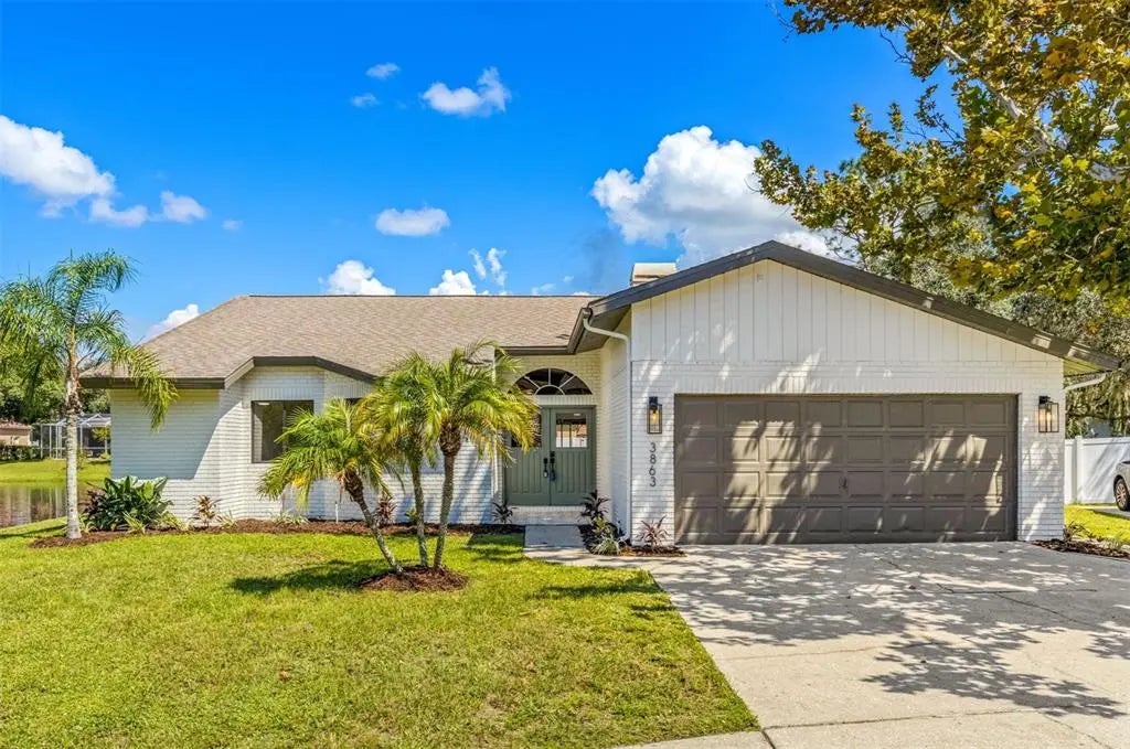 *Seller offering up to $24,000 of flex cash towards Buyers closing costs with an acceptable offer.* STUNNING Brick Pool home! Enjoy lake water views in this beautifully updated 3 bedroom + Office/Flex space, 2 bath, 2 car garage pool home located in a quiet cul de sac of Whispering Lakes! New HVAC (2023). Newer Roof (2020). Newly resurfaced pool (2024). As you walk up to this home, you will notice the contemporary brick facade featuring modern paint scheme and welcoming mosaic tile entryway to your glass double door entry. Inside boasts vaulted ceilings, fresh paint, luxury waterproof vinyl plank flooring and new modern fixtures. Huge kitchen with 42" Shaker cabinets providing plenty of storage, Carrera Quartz counter tops, stainless steel appliances, modern subway tile backsplash, and desired eat-in dinette area. French doors overlooking your pool area allow plenty of natural light. Open concept family room and formal dining area showcasing trim accent wall all surrounding your focal point brick fireplace - perfect for entertaining! Ideal double door entry to your desirable office/flex space. Spacious Primary suite boasts sizeable walk-in closet for all your needs. Escape to your spa-like retreat en suite bathroom with oversized double sink Quartz top vanity, seamless glass shower stall with gleaming tile finishes and private access to the pool/lanai area. Guest bedrooms provide plenty of space and have new plush carpeting. Tastefully updated hall bathroom has Quartz top vanity, hexagon tile flooring and natural tile finishes in your shower/tub combo. Bonus relaxation space with endless possibilities. Sliding doors lead to your newly screened lanai surrounding your modernized and resurfaced pool overlooking your peaceful water views. Whispering Lakes offers community pickle ball courts, basketball court and park overlooking tranquil water views. Close to Pinellas County pristine beaches, Brooker Creek Preserve, East Lake/Boot Ranch shops and restaurants, various Golf Clubs, Tampa area airports, Tarpon Springs Sponge Docks and more!