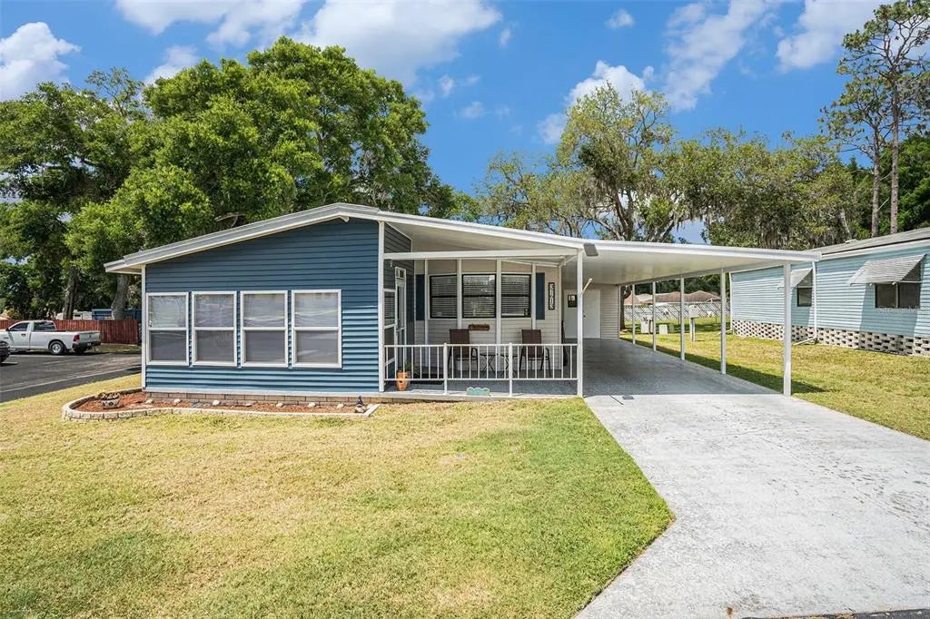 Welcome to your new oasis in the serene 55+ community of Spanish Trails West, nestled in the heart of beautiful Zephyrhills. This charming corner lot manufactured home has a 2023 roof & water heater and boasts comfort, convenience, and a variety of amenities. The home also includes $50k of land share/deed. Step onto the welcoming front porch and into a meticulously maintained interior featuring high ceilings, creating an airy and spacious ambiance throughout. The living room/dining room combo is perfect for entertaining, with ample space for gatherings and relaxation. Adjacent to the living area, you'll find a dining room adorned with built-in cabinets and shelving, ideal for displaying your cherished collectibles. The kitchen, complete with wood-look vinyl flooring and a skylight, offers an open layout that makes meal preparation a breeze. Unwind in the cozy Florida room, complete with a ceiling fan for added comfort, or retreat to the primary bedroom featuring its own ceiling fan and a private attached bathroom with plenty of storage space. Additional conveniences include an inside laundry room and an extra storage closet. Outside, enjoy the Florida sunshine in the beautiful community, which offers an array of amenities including a heated pool, clubhouse with various activities, covered shuffleboard courts, and a tennis/pickleball court. For furry friends, there's even a fenced dog run. With low HOA fees that include cable TV, internet, trash, and more, you'll enjoy a maintenance-free lifestyle. Plus, you're conveniently located near shopping centers, restaurants, and medical facilities, ensuring all your needs are within easy reach. Don't miss out on this opportunity to live the ultimate Florida lifestyle in Spanish Trails West. Schedule your showing today and make this charming manufactured home your own!