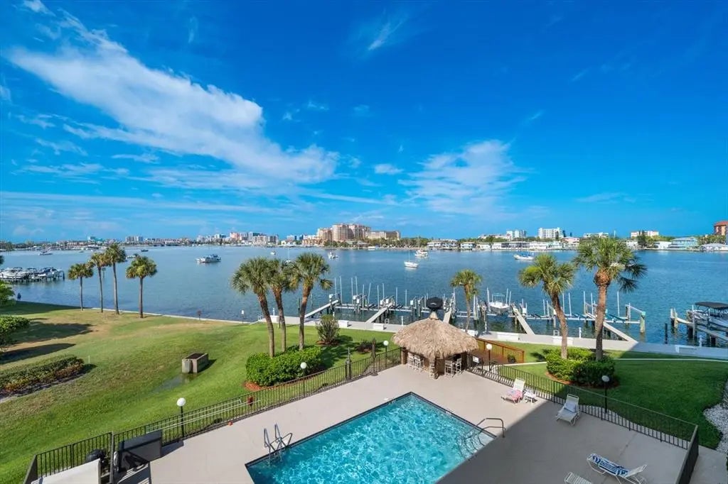 TWO SIDE BY SIDE 40 FT. EACH OPEN WATER & HARBOR FRONT BOAT DOCKS W/ 13,000LB. & 10,000LB. LIFTS RESPECTIVELY OFFER DIRECT INTRACOASTAL WATERWAY & GULF OF MEXICO ACCESS, AND CONVEY IN THE SALE OF THIS SPECTACULAR ISLAND ESTATES CONDO HOME. The view is immediate, and without obstruction, as the building is cantilevered over the widest stretch of Clearwater Harbor, as it descends into Mandalay Channel. THE EXPOSURES? MAGNIFICENT AND FAR REACHING. IMAGINE SOUTH AND WEST ORIENTATIONS OVER THE BREADTH OF THE ENTIRE CLEARWATER BEACH SKY AND COAST LINE WITH POIGNANT SUNSETS OVER THE GULF, WHILST COMPELLING DAY AND NIGHT TIME PANORAMAS ENGAGE YOUR SIGHT AND SENSES WITH CLEARWATER HARBOR POISED DIRECTLY BEFORE YOU. Perfectly positioned in the center of the building, an elongated balcony with Fabulous Full pool views encompasses the entire width of the apartment with the primary suite, living and dining arenas with kitchen enjoying the aforementioned jaw dropping views. NOW FOR THE INTERIORS..A SOFT SPOKEN MODERN APPROACH TAKES CENTER STAGE AS WHITE CRISP KITCHEN CABINETRY, RICH GRANITE COUNTERS AND SUPERIOR STAINLESS STEEL APPLIANCES LEND TO A TIMELESS, INTEGRATED KITCHEN W/ HIGHTOP BAR, A LUXURY PLANK FLOOR BELIES AN EARTHY TEXTURE THAT SEAMLESSLY BLENDS A MODERN, YET TRANSITIONAL AESTHETIC THROUGHOUT. HEIRLOOM LEGACY LIGHTING FIXTURES ARE WELL PAIRED WITH MODERN BLACK & WHITE DOOR HARDWARE AS ALL OF THE ABOVE IS FRAMED BY A DESIGNER SILVERY WHITE PAINT PALETTE FINISHED WITH LEVEL 5 SKIM COATED CEILINGS. Both the primary and second bedrooms are capacious enough to house KING AND QUEEN BEDS, and come as full en-suites w/adjoining baths. The primary offers enough space to outfit a home office within, and a volume walk-in closet. Exceptional vanities outfitted w/bespoke plumbing, mirrors and commodes in both baths. An in-unit laundry with full size stackables and a dedicated pantry almost completes the resume of this EXCEPTIONAL CONDO HOME..Now for OUR COMMUNITY: ISLAND ESTATES IS WELL VERSED FOR ITS’ SELF CONTAINED NATURE, FROM FINE & CASUAL DINING TO WELL APPOINTED GROCERY STORES, HAIR SALONS, BANKS, CONVENIENCE STORES, AND SERVICE STATIONS, NOT TO MENTION THE VERY RECREATIONAL VEHICLES OF BIKING, SWIMMING AND BOATING YEAR ROUND IN THIS MODERN DAY MAYBERRY. 650 Island Way as an association has undergone tremendous structural improvements most recently having completed a complete revamp of their boat docks, walkway and promenade. Also, new elevators enhance your visual perception as you ascend to your new home. COVERED CARPORT PARKING SPACE #66 also conveys in the sale, and there is a storage closet located immediately off of your balcony. MAY BE SOLD TURN KEY FURNISHED FOR YOUR CONVENIENCE, SOME PERSONAL EXCEPTIONS, ASIDE. Come visit me, I’m looking forward to your impressions..