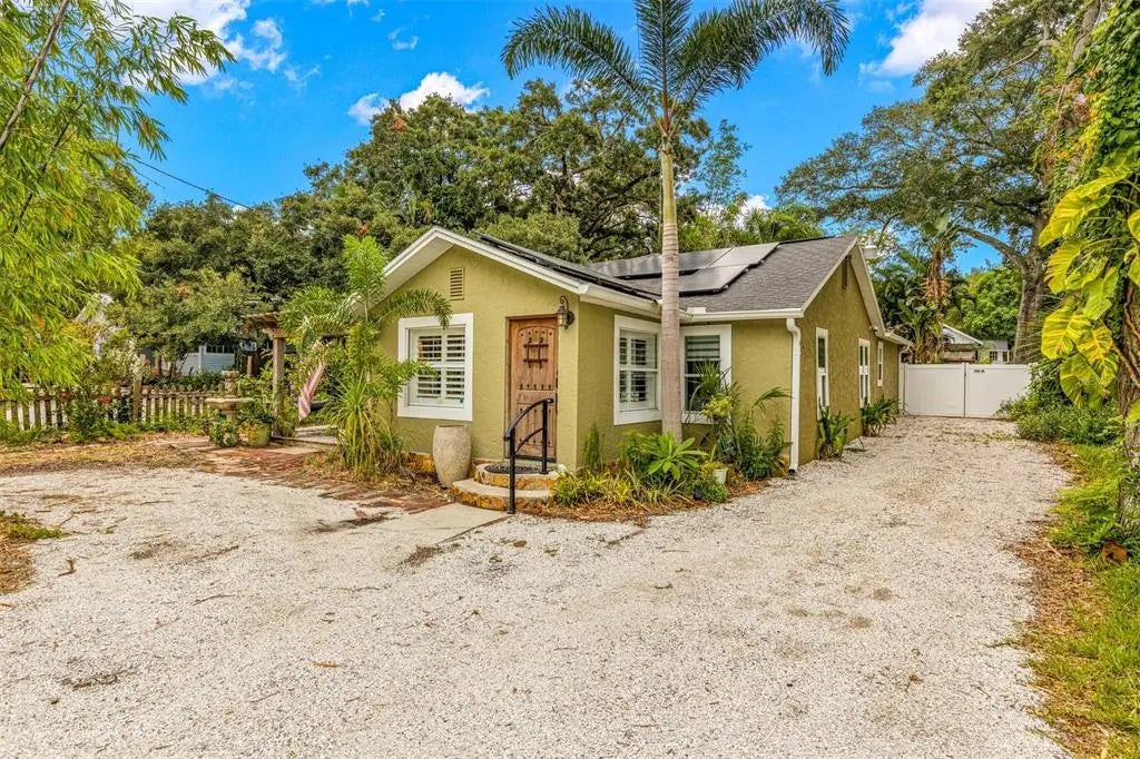 Nestled just a block away from the serene Whitcomb Bayou, this truly one-of-a-kind property exudes storybook charm and character. Featuring a 3-bedroom, 2-bathroom main home and a fully furnished guest cottage with A/C and plumbing, this property offers endless opportunities for versatile living. As you arrive, you'll appreciate the ample parking, complete with space for a boat and RV, and the convenience of RV water/electric and sewer connections. The property boasts completely paid-off solar panels, ensuring minimal energy costs for years to come, along with new covered gutters that come with a lifetime warranty. The main home welcomes you with an inviting front porch deck nestled under a charming pergola, where you can relax to the sound of water fountains beneath a canopy of large oak trees. Enter through the natural wood French doors to discover stunning hardwood flooring throughout, beautifully complemented by plantation shutters and cordless Levolor light filtering roller shades in the family room and dining area. The kitchen, beautifully remodeled in 2021, features elegant wood cabinetry, quartz countertops, and a Rockledge backsplash. Modern stainless steel appliances, including a farmhouse sink, are highlighted by stylish pendant lighting. The owner’s suite, framed by crown molding and high ceilings, includes a large walk-in closet and an ensuite bathroom with dual glass vessel sinks atop a granite countertop and a stand-up shower with a frosted glass door. Both guest bedrooms are generously sized and feature tray ceilings that elevate the space. Indoor laundry adds convenience to your daily routine. Numerous upgrades provide peace of mind, including two A/C units (one replaced in 2023) with separate thermostats, newer double pane windows replaced throughout in 2020 for energy efficiency, and a water filtration system installed in 2021. The backyard is a true entertainer's paradise, featuring a brick-lined pathway leading to a hot tub and seating area, and a barn shed transformed into a cozy 360 sqft guest cottage in 2022. This charming guest house includes a loft area for sleeping, beautiful arches, its own bathroom, and a kitchenette, offering a unique living experience. There is also a separate shed providing additional storage or the perfect creative space for an artist’s studio. This home offers a unique living experience, golf cart friendly with nearby amenities such as the Tarpon Springs Golf Club, downtown Tarpon Springs, the Pinellas Trail, the world-famous Sponge Docks, Fred Howard Park, and more. Enjoy easy access to Tampa, Clearwater Beach, Dunedin, Honeymoon Island, and Caladesi Island. This property is not just a home, but a way of life. Here time slows down letting your creative ideas run wild, don’t let this home get away, schedule your showing today.
