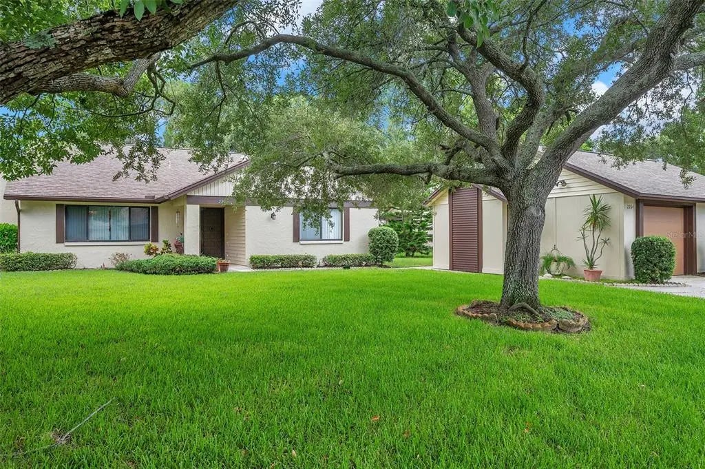 Welcome home to your single family home in the much sought after community of Village on the Green. This home is a rare find in Village on the Green, nestled on quiet Sequoia Dr. and is one of the larger floor plans of the patio homes. The home had a new roof and new electric panel installed, Sept. 2024. Enter into the large living room with Vaulted ceilings and a fireplace as the center piece, your living room overlooks the kitchen, dining room and the screened lanai. Your home features 2 bedrooms and 2 full bathrooms, inside laundry, and a detached 1 car garage. The primary bedroom is extra large, has a walk in closet and an en-suite bathroom. The second bedroom also has a walk in closet. The screened lanai is the perfect place to sip your morning coffee and relax in the evening where you will enjoy the peaceful surroundings. Village on the Green is a great community with a community pool, clubhouse, shuffle board, and a picnic area with grills. The clubhouse has an exercise room, library, billiard table and a card room where residents have regular card and game events. The clubhouse also features a kitchen and a large meeting room where the community host social events. The HOA has low fees that include, lawn cutting, fertilizing and watering, cable TV, internet and the spectacular recreation center. Village on the Green is an active 55+ community just off of Main Street and Belcher. Enjoy a 10 minute ride to downtown Dunedin or a 5 minute ride to Countryside Mall. If you have been looking for a low maintenance home, close to restaurants, shopping, beaches and parks, this is it.